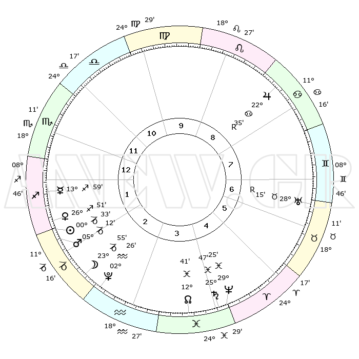 | | ΘΕΣΕΙΣ ΠΛΑΝΗΤΩΝ ΑΣΤΡΟΛΟΓΙΚΟΥ ΧΑΡΤΗ ΤΗΣ ΣΤΙΓΜΗΣ ΑΥΤΗΣ | | | | Πλανήτης | Ζώδιο | Μοίρες | Δεκαήμ. | Σε οίκο | Απόκλιση | | Ακμές των οίκων | | Ηλιος | Αιγόκερως | 00°28' | Πρώτο | 2 | 23 S 26 | | 1ος | 13°49' | Σκορπιός | | Σελήνη | Αιγόκερως | 22°52' | Τρίτο | 3 | 25 S 13 | | 2ος | 13°12' | Τοξότης | | Ερμής | Τοξότης | 13°51' | Δεύτερο | 2 | 21 S 50 | | 3ος | 16°32' | Αιγόκερως | | Αφροδίτη | Τοξότης | 26°44' | Τρίτο | 2 | 23 S 31 | | 4ος | 21°43' | Υδροχόος | | Αρης | Αιγόκερως | 05°08' | Πρώτο | 2 | 24 S 09 | | 5ος | 24°13' | Ιχθείς | | Δίας | Καρκίνος | 22°35'R | Τρίτο | 9 | 21 N 45 | | 6ος | 21°24' | Κριός | | Κρόνος | Ιχθείς | 25°47' | Τρίτο | 5 | 03 S 47 | | 7ος | 13°49' | Ταύρος | | Ουρανός | Ταύρος | 28°15'R | Τρίτο | 7 | 19 N 34 | | 8ος | 13°12' | Δίδυμοι | | Ποσειδώνας | Ιχθείς | 29°25' | Τρίτο | 5 | 01 S 28 | | 9ος | 16°32' | Καρκίνος | | Πλούτωνας | Υδροχόος | 02°26' | Πρώτο | 3 | 23 S 17 | | 10ος | 21°43' | Λέων | | Β. Δεσμός | Ιχθείς | 12°42' | Δεύτερο | 4 | 06 S 48 | | 11ος | 24°13' | Παρθένος | | Ωροσκόπος | Σκορπιός | 13°49' | Δεύτερο | | | 12ος | 21°24' | Ζυγός | | Μεσουράνημα | Λέων | 21°43' | Τρίτο | | | |