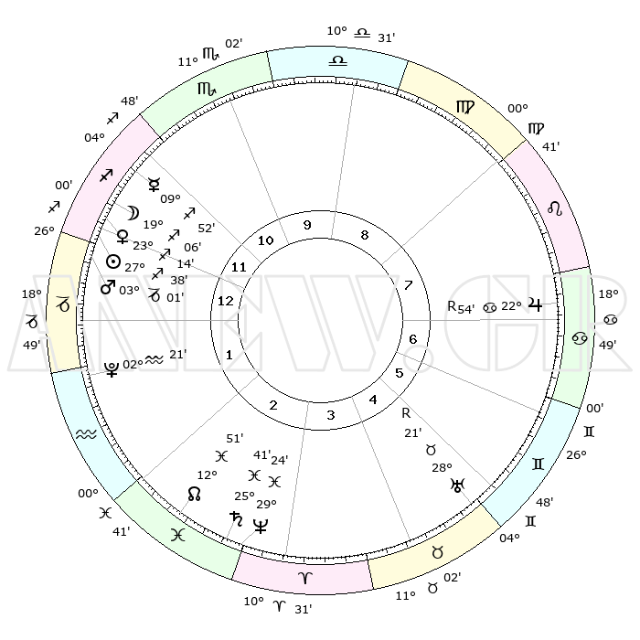 | | ΘΕΣΕΙΣ ΠΛΑΝΗΤΩΝ ΑΣΤΡΟΛΟΓΙΚΟΥ ΧΑΡΤΗ ΤΗΣ ΣΤΙΓΜΗΣ ΑΥΤΗΣ | | | | Πλανήτης | Ζώδιο | Μοίρες | Δεκαήμ. | Σε οίκο | Απόκλιση | | Ακμές των οίκων | | Ηλιος | Τοξότης | 27°18' | Τρίτο | 3 | 23 S 24 | | 1ος | 07°35' | Ζυγός | | Σελήνη | Τοξότης | 15°09' | Δεύτερο | 3 | 27 S 34 | | 2ος | 04°41' | Σκορπιός | | Ερμής | Τοξότης | 09°24' | Πρώτο | 3 | 20 S 50 | | 3ος | 05°24' | Τοξότης | | Αφροδίτη | Τοξότης | 22°49' | Τρίτο | 3 | 23 S 14 | | 4ος | 08°31' | Αιγόκερως | | Αρης | Αιγόκερως | 02°46' | Πρώτο | 3 | 24 S 12 | | 5ος | 11°27' | Υδροχόος | | Δίας | Καρκίνος | 22°57'R | Τρίτο | 10 | 21 N 41 | | 6ος | 11°35' | Ιχθείς | | Κρόνος | Ιχθείς | 25°40' | Τρίτο | 6 | 03 S 50 | | 7ος | 07°35' | Κριός | | Ουρανός | Ταύρος | 28°21'R | Τρίτο | 8 | 19 N 36 | | 8ος | 04°41' | Ταύρος | | Ποσειδώνας | Ιχθείς | 29°24' | Τρίτο | 6 | 01 S 28 | | 9ος | 05°24' | Δίδυμοι | | Πλούτωνας | Υδροχόος | 02°21' | Πρώτο | 4 | 23 S 18 | | 10ος | 08°31' | Καρκίνος | | Β. Δεσμός | Ιχθείς | 12°52' | Δεύτερο | 6 | 06 S 44 | | 11ος | 11°27' | Λέων | | Ωροσκόπος | Ζυγός | 07°35' | Πρώτο | | | 12ος | 11°35' | Παρθένος | | Μεσουράνημα | Καρκίνος | 08°31' | Πρώτο | | | |