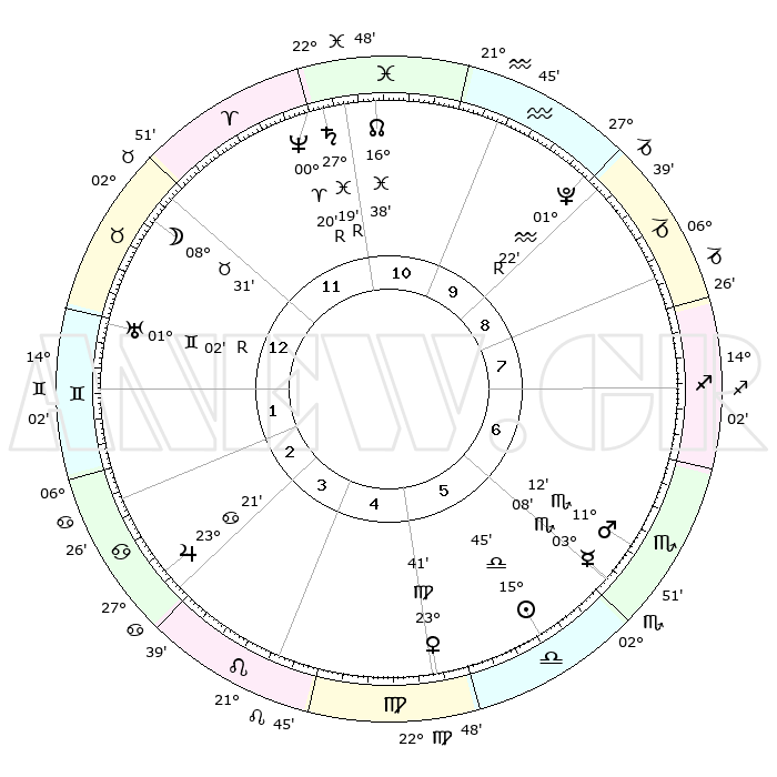 | ΘΕΣΕΙΣ ΠΛΑΝΗΤΩΝ ΑΣΤΡΟΛΟΓΙΚΟΥ ΧΑΡΤΗ ΤΗΣ ΣΤΙΓΜΗΣ ΑΥΤΗΣ | | Πλανήτης | Ζώδιο | Μοίρες | Δεκαήμ. | Σε οίκο | Απόκλιση | | Ακμές των οίκων | Ηλιος | Ζυγός | 15°40' | Δεύτερο | 6 | 06 S 10 | | 1ος | 06°44' | Ταύρος | Σελήνη | Ταύρος | 07°15' | Πρώτο | 1 | 17 N 39 | | 2ος | 07°07' | Δίδυμοι | Ερμής | Σκορπιός | 03°01' | Πρώτο | 6 | 13 S 28 | | 3ος | 00°02' | Καρκίνος | Αφροδίτη | Παρθένος | 23°35' | Τρίτο | 6 | 03 N 52 | | 4ος | 21°47' | Καρκίνος | Αρης | Σκορπιός | 11°09' | Δεύτερο | 7 | 15 S 19 | | 5ος | 16°54' | Λέων | Δίας | Καρκίνος | 23°20' | Τρίτο | 4 | 21 N 27 | | 6ος | 20°57' | Παρθένος | Κρόνος | Ιχθείς | 27°19'R | Τρίτο | 12 | 03 S 22 | | 7ος | 06°44' | Σκορπιός | Ουρανός | Δίδυμοι | 01°02'R | Πρώτο | 1 | 20 N 09 | | 8ος | 07°07' | Τοξότης | Ποσειδώνας | Κριός | 00°20'R | Πρώτο | 12 | 01 S 08 | | 9ος | 00°02' | Αιγόκερως | Πλούτωνας | Υδροχόος | 01°22'R | Πρώτο | 10 | 23 S 32 | | 10ος | 21°47' | Αιγόκερως | Β. Δεσμός | Ιχθείς | 16°38' | Δεύτερο | 11 | 05 S 17 | | 11ος | 16°54' | Υδροχόος | Ωροσκόπος | Ταύρος | 06°44' | Πρώτο | | | 12ος | 20°57' | Ιχθείς | Μεσουράνημα | Αιγόκερως | 21°47' | Τρίτο | | | |