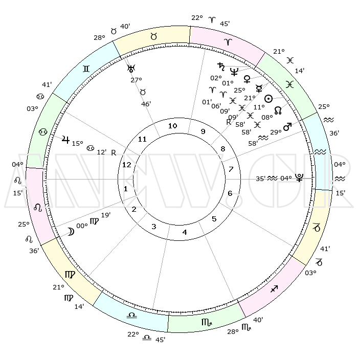 | | ΘΕΣΕΙΣ ΠΛΑΝΗΤΩΝ ΑΣΤΡΟΛΟΓΙΚΟΥ ΧΑΡΤΗ ΤΗΣ ΣΤΙΓΜΗΣ ΑΥΤΗΣ | | | | Πλανήτης | Ζώδιο | Μοίρες | Δεκαήμ. | Σε οίκο | Απόκλιση | | Ακμές των οίκων | | Ηλιος | Ιχθείς | 11°54' | Δεύτερο | 9 | 07 S 06 | | 1ος | 16°35' | Καρκίνος | | Σελήνη | Λέων | 29°31' | Τρίτο | 2 | 12 N 27 | | 2ος | 07°03' | Λέων | | Ερμής | Ιχθείς | 21°11'R | Τρίτο | 9 | 00 S 17 | | 3ος | 00°23' | Παρθένος | | Αφροδίτη | Ιχθείς | 25°05' | Τρίτο | 9 | 03 S 11 | | 4ος | 29°27' | Παρθένος | | Αρης | Υδροχόος | 29°56' | Τρίτο | 8 | 12 S 31 | | 5ος | 05°16' | Σκορπιός | | Δίας | Καρκίνος | 15°12'R | Δεύτερο | 12 | 22 N 55 | | 6ος | 13°13' | Τοξότης | | Κρόνος | Κριός | 02°01' | Πρώτο | 10 | 01 S 09 | | 7ος | 16°35' | Αιγόκερως | | Ουρανός | Ταύρος | 27°46' | Τρίτο | 11 | 19 N 29 | | 8ος | 07°03' | Υδροχόος | | Ποσειδώνας | Κριός | 01°06' | Πρώτο | 10 | 00 S 46 | | 9ος | 00°23' | Ιχθείς | | Πλούτωνας | Υδροχόος | 04°35' | Πρώτο | 7 | 22 S 52 | | 10ος | 29°27' | Ιχθείς | | Β. Δεσμός | Ιχθείς | 08°58' | Πρώτο | 9 | 08 S 12 | | 11ος | 05°16' | Ταύρος | | Ωροσκόπος | Καρκίνος | 16°35' | Δεύτερο | | | 12ος | 13°13' | Δίδυμοι | | Μεσουράνημα | Ιχθείς | 29°27' | Τρίτο | | | |