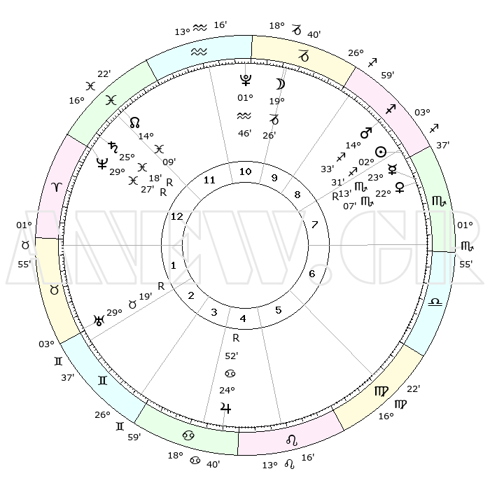 | | ΘΕΣΕΙΣ ΠΛΑΝΗΤΩΝ ΑΣΤΡΟΛΟΓΙΚΟΥ ΧΑΡΤΗ ΤΗΣ ΣΤΙΓΜΗΣ ΑΥΤΗΣ | | | | Πλανήτης | Ζώδιο | Μοίρες | Δεκαήμ. | Σε οίκο | Απόκλιση | | Ακμές των οίκων | | Ηλιος | Τοξότης | 02°28' | Πρώτο | 8 | 20 S 39 | | 1ος | 27°49' | Ιχθείς | | Σελήνη | Αιγόκερως | 18°42' | Δεύτερο | 10 | 26 S 14 | | 2ος | 08°38' | Ταύρος | | Ερμής | Σκορπιός | 23°17'R | Τρίτο | 8 | 16 S 53 | | 3ος | 06°22' | Δίδυμοι | | Αφροδίτη | Σκορπιός | 22°03' | Τρίτο | 8 | 17 S 23 | | 4ος | 28°46' | Δίδυμοι | | Αρης | Τοξότης | 14°30' | Δεύτερο | 9 | 23 S 08 | | 5ος | 20°59' | Καρκίνος | | Δίας | Καρκίνος | 24°53'R | Τρίτο | 5 | 21 N 17 | | 6ος | 18°03' | Λέων | | Κρόνος | Ιχθείς | 25°18'R | Τρίτο | 12 | 04 S 04 | | 7ος | 27°49' | Παρθένος | | Ουρανός | Ταύρος | 29°19'R | Τρίτο | 2 | 19 N 48 | | 8ος | 08°38' | Σκορπιός | | Ποσειδώνας | Ιχθείς | 29°27'R | Τρίτο | 1 | 01 S 28 | | 9ος | 06°22' | Τοξότης | | Πλούτωνας | Υδροχόος | 01°46' | Πρώτο | 11 | 23 S 26 | | 10ος | 28°46' | Τοξότης | | Β. Δεσμός | Ιχθείς | 14°09' | Δεύτερο | 12 | 06 S 14 | | 11ος | 20°59' | Αιγόκερως | | Ωροσκόπος | Ιχθείς | 27°49' | Τρίτο | | | 12ος | 18°03' | Υδροχόος | | Μεσουράνημα | Τοξότης | 28°46' | Τρίτο | | | |