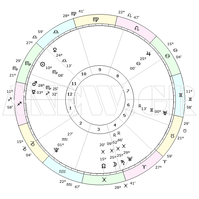 | | ΘΕΣΕΙΣ ΠΛΑΝΗΤΩΝ ΑΣΤΡΟΛΟΓΙΚΟΥ ΧΑΡΤΗ ΤΗΣ ΣΤΙΓΜΗΣ ΑΥΤΗΣ | | | | Πλανήτης | Ζώδιο | Μοίρες | Δεκαήμ. | Σε οίκο | Απόκλιση | | Ακμές των οίκων | | Ηλιος | Σκορπιός | 09°30' | Πρώτο | 6 | 14 S 39 | | 1ος | 00°53' | Δίδυμοι | | Σελήνη | Ιχθείς | 16°18' | Δεύτερο | 11 | 05 S 28 | | 2ος | 25°31' | Δίδυμοι | | Ερμής | Τοξότης | 03°01' | Πρώτο | 7 | 23 S 36 | | 3ος | 16°54' | Καρκίνος | | Αφροδίτη | Ζυγός | 23°26' | Τρίτο | 6 | 07 S 44 | | 4ος | 09°44' | Λέων | | Αρης | Σκορπιός | 27°58' | Τρίτο | 6 | 20 S 05 | | 5ος | 08°21' | Παρθένος | | Δίας | Καρκίνος | 24°59' | Τρίτο | 3 | 21 N 13 | | 6ος | 16°56' | Ζυγός | | Κρόνος | Ιχθείς | 25°54'R | Τρίτο | 11 | 03 S 54 | | 7ος | 00°53' | Τοξότης | | Ουρανός | Δίδυμοι | 00°15'R | Πρώτο | 12 | 20 N 00 | | 8ος | 25°31' | Τοξότης | | Ποσειδώνας | Ιχθείς | 29°46'R | Τρίτο | 11 | 01 S 21 | | 9ος | 16°54' | Αιγόκερως | | Πλούτωνας | Υδροχόος | 01°27' | Πρώτο | 9 | 23 S 31 | | 10ος | 09°44' | Υδροχόος | | Β. Δεσμός | Ιχθείς | 15°22' | Δεύτερο | 11 | 05 S 46 | | 11ος | 08°21' | Ιχθείς | | Ωροσκόπος | Δίδυμοι | 00°53' | Πρώτο | | | 12ος | 16°56' | Κριός | | Μεσουράνημα | Υδροχόος | 09°44' | Πρώτο | | | |
