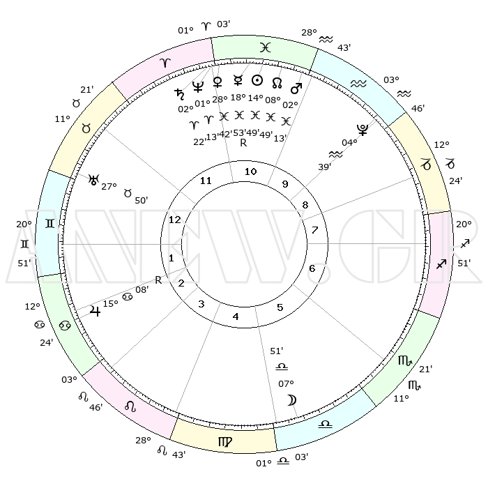 | | ΘΕΣΕΙΣ ΠΛΑΝΗΤΩΝ ΑΣΤΡΟΛΟΓΙΚΟΥ ΧΑΡΤΗ ΤΗΣ ΣΤΙΓΜΗΣ ΑΥΤΗΣ | | | | Πλανήτης | Ζώδιο | Μοίρες | Δεκαήμ. | Σε οίκο | Απόκλιση | | Ακμές των οίκων | | Ηλιος | Ιχθείς | 14°45' | Δεύτερο | 11 | 06 S 00 | | 1ος | 21°16' | Ταύρος | | Σελήνη | Ζυγός | 06°55' | Πρώτο | 6 | 05 S 01 | | 2ος | 17°59' | Δίδυμοι | | Ερμής | Ιχθείς | 18°57'R | Δεύτερο | 11 | 00 S 59 | | 3ος | 09°48' | Καρκίνος | | Αφροδίτη | Ιχθείς | 28°37' | Τρίτο | 11 | 01 S 44 | | 4ος | 02°02' | Λέων | | Αρης | Ιχθείς | 02°10' | Πρώτο | 11 | 11 S 43 | | 5ος | 29°05' | Λέων | | Δίας | Καρκίνος | 15°08'R | Δεύτερο | 3 | 22 N 55 | | 6ος | 06°00' | Ζυγός | | Κρόνος | Κριός | 02°21' | Πρώτο | 11 | 01 S 01 | | 7ος | 21°16' | Σκορπιός | | Ουρανός | Ταύρος | 27°50' | Τρίτο | 1 | 19 N 30 | | 8ος | 17°59' | Τοξότης | | Ποσειδώνας | Κριός | 01°12' | Πρώτο | 11 | 00 S 43 | | 9ος | 09°48' | Αιγόκερως | | Πλούτωνας | Υδροχόος | 04°39' | Πρώτο | 10 | 22 S 51 | | 10ος | 02°02' | Υδροχόος | | Β. Δεσμός | Ιχθείς | 08°49' | Πρώτο | 11 | 08 S 16 | | 11ος | 29°05' | Υδροχόος | | Ωροσκόπος | Ταύρος | 21°16' | Τρίτο | | | 12ος | 06°00' | Κριός | | Μεσουράνημα | Υδροχόος | 02°02' | Πρώτο | | | |