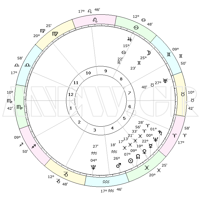 | | ΘΕΣΕΙΣ ΠΛΑΝΗΤΩΝ ΑΣΤΡΟΛΟΓΙΚΟΥ ΧΑΡΤΗ ΤΗΣ ΣΤΙΓΜΗΣ ΑΥΤΗΣ | | | | Πλανήτης | Ζώδιο | Μοίρες | Δεκαήμ. | Σε οίκο | Απόκλιση | | Ακμές των οίκων | | Ηλιος | Ιχθείς | 07°13' | Πρώτο | 5 | 08 S 52 | | 1ος | 19°53' | Ζυγός | | Σελήνη | Δίδυμοι | 24°22' | Τρίτο | 9 | 28 N 24 | | 2ος | 17°43' | Σκορπιός | | Ερμής | Ιχθείς | 22°33' | Τρίτο | 5 | 00 S 29 | | 3ος | 19°00' | Τοξότης | | Αφροδίτη | Ιχθείς | 19°15' | Δεύτερο | 5 | 05 S 32 | | 4ος | 22°35' | Αιγόκερως | | Αρης | Υδροχόος | 26°15' | Τρίτο | 5 | 13 S 48 | | 5ος | 25°32' | Υδροχόος | | Δίας | Καρκίνος | 15°22'R | Δεύτερο | 9 | 22 N 53 | | 6ος | 24°60' | Ιχθείς | | Κρόνος | Κριός | 01°28' | Πρώτο | 6 | 01 S 23 | | 7ος | 19°53' | Κριός | | Ουρανός | Ταύρος | 27°40' | Τρίτο | 8 | 19 N 27 | | 8ος | 17°43' | Ταύρος | | Ποσειδώνας | Κριός | 00°56' | Πρώτο | 6 | 00 S 50 | | 9ος | 19°00' | Δίδυμοι | | Πλούτωνας | Υδροχόος | 04°27' | Πρώτο | 4 | 22 S 53 | | 10ος | 22°35' | Καρκίνος | | Β. Δεσμός | Ιχθείς | 09°13' | Πρώτο | 5 | 08 S 07 | | 11ος | 25°32' | Λέων | | Ωροσκόπος | Ζυγός | 19°53' | Δεύτερο | | | 12ος | 24°60' | Παρθένος | | Μεσουράνημα | Καρκίνος | 22°35' | Τρίτο | | | |