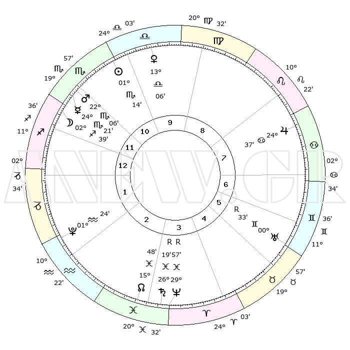 | | ΘΕΣΕΙΣ ΠΛΑΝΗΤΩΝ ΑΣΤΡΟΛΟΓΙΚΟΥ ΧΑΡΤΗ ΤΗΣ ΣΤΙΓΜΗΣ ΑΥΤΗΣ | | | | Πλανήτης | Ζώδιο | Μοίρες | Δεκαήμ. | Σε οίκο | Απόκλιση | | Ακμές των οίκων | | Ηλιος | Ζυγός | 29°23' | Τρίτο | 8 | 11 S 15 | | 1ος | 23°55' | Υδροχόος | | Σελήνη | Σκορπιός | 10°28' | Δεύτερο | 8 | 18 S 51 | | 2ος | 09°40' | Κριός | | Ερμής | Σκορπιός | 22°04' | Τρίτο | 9 | 20 S 38 | | 3ος | 13°36' | Ταύρος | | Αφροδίτη | Ζυγός | 10°46' | Δεύτερο | 8 | 02 S 51 | | 4ος | 08°39' | Δίδυμοι | | Αρης | Σκορπιός | 20°47' | Τρίτο | 9 | 18 S 14 | | 5ος | 00°23' | Καρκίνος | | Δίας | Καρκίνος | 24°30' | Τρίτο | 6 | 21 N 17 | | 6ος | 23°21' | Καρκίνος | | Κρόνος | Ιχθείς | 26°25'R | Τρίτο | 1 | 03 S 42 | | 7ος | 23°55' | Λέων | | Ουρανός | Δίδυμοι | 00°37'R | Πρώτο | 3 | 20 N 04 | | 8ος | 09°40' | Ζυγός | | Ποσειδώνας | Ιχθείς | 29°60'R | Τρίτο | 1 | 01 S 16 | | 9ος | 13°36' | Σκορπιός | | Πλούτωνας | Υδροχόος | 01°23' | Πρώτο | 12 | 23 S 32 | | 10ος | 08°39' | Τοξότης | | Β. Δεσμός | Ιχθείς | 15°54' | Δεύτερο | 1 | 05 S 34 | | 11ος | 00°23' | Αιγόκερως | | Ωροσκόπος | Υδροχόος | 23°55' | Τρίτο | | | 12ος | 23°21' | Αιγόκερως | | Μεσουράνημα | Τοξότης | 08°39' | Πρώτο | | | |