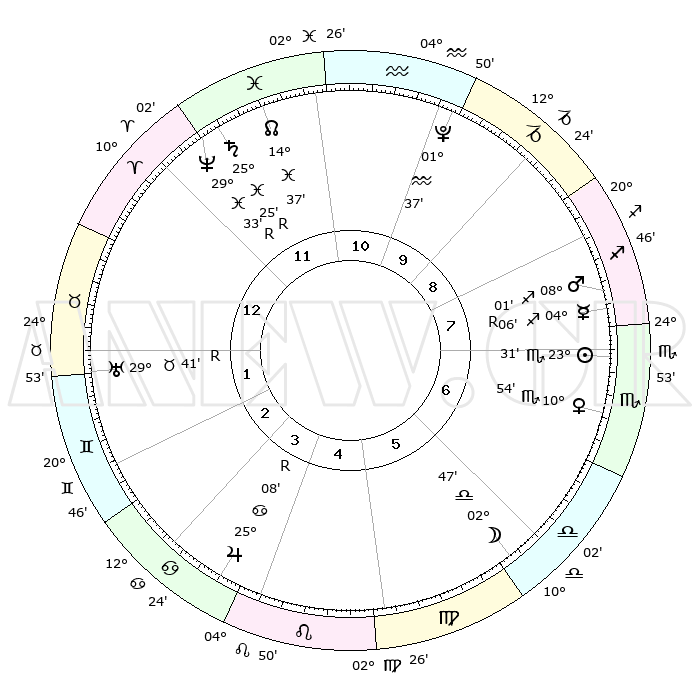 | | ΘΕΣΕΙΣ ΠΛΑΝΗΤΩΝ ΑΣΤΡΟΛΟΓΙΚΟΥ ΧΑΡΤΗ ΤΗΣ ΣΤΙΓΜΗΣ ΑΥΤΗΣ | | | | Πλανήτης | Ζώδιο | Μοίρες | Δεκαήμ. | Σε οίκο | Απόκλιση | | Ακμές των οίκων | | Ηλιος | Σκορπιός | 23°26' | Τρίτο | 8 | 18 S 38 | | 1ος | 15°58' | Κριός | | Σελήνη | Ζυγός | 01°52' | Πρώτο | 6 | 02 S 00 | | 2ος | 22°05' | Ταύρος | | Ερμής | Τοξότης | 04°11'R | Πρώτο | 8 | 22 S 01 | | 3ος | 17°15' | Δίδυμοι | | Αφροδίτη | Σκορπιός | 10°49' | Δεύτερο | 7 | 13 S 56 | | 4ος | 09°03' | Καρκίνος | | Αρης | Τοξότης | 07°58' | Πρώτο | 8 | 22 S 09 | | 5ος | 02°16' | Λέων | | Δίας | Καρκίνος | 25°08'R | Τρίτο | 4 | 21 N 13 | | 6ος | 02°19' | Παρθένος | | Κρόνος | Ιχθείς | 25°26'R | Τρίτο | 12 | 04 S 03 | | 7ος | 15°58' | Ζυγός | | Ουρανός | Ταύρος | 29°41'R | Τρίτο | 2 | 19 N 53 | | 8ος | 22°05' | Σκορπιός | | Ποσειδώνας | Ιχθείς | 29°33'R | Τρίτο | 12 | 01 S 26 | | 9ος | 17°15' | Τοξότης | | Πλούτωνας | Υδροχόος | 01°37' | Πρώτο | 10 | 23 S 28 | | 10ος | 09°03' | Αιγόκερως | | Β. Δεσμός | Ιχθείς | 14°38' | Δεύτερο | 12 | 06 S 03 | | 11ος | 02°16' | Υδροχόος | | Ωροσκόπος | Κριός | 15°58' | Δεύτερο | | | 12ος | 02°19' | Ιχθείς | | Μεσουράνημα | Αιγόκερως | 09°03' | Πρώτο | | | |