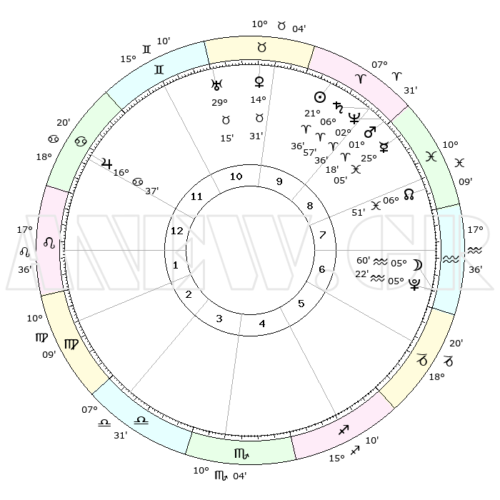 | | ΘΕΣΕΙΣ ΠΛΑΝΗΤΩΝ ΑΣΤΡΟΛΟΓΙΚΟΥ ΧΑΡΤΗ ΤΗΣ ΣΤΙΓΜΗΣ ΑΥΤΗΣ | | | | Πλανήτης | Ζώδιο | Μοίρες | Δεκαήμ. | Σε οίκο | Απόκλιση | | Ακμές των οίκων | | Ηλιος | Κριός | 21°33' | Τρίτο | 10 | 08 N 24 | | 1ος | 29°39' | Καρκίνος | | Σελήνη | Υδροχόος | 05°14' | Πρώτο | 7 | 21 S 41 | | 2ος | 20°40' | Λέων | | Ερμής | Ιχθείς | 24°60' | Τρίτο | 9 | 04 S 13 | | 3ος | 15°40' | Παρθένος | | Αφροδίτη | Ταύρος | 14°27' | Δεύτερο | 10 | 16 N 11 | | 4ος | 16°40' | Ζυγός | | Αρης | Κριός | 01°16' | Πρώτο | 9 | 00 S 25 | | 5ος | 22°43' | Σκορπιός | | Δίας | Καρκίνος | 16°37' | Δεύτερο | 12 | 22 N 46 | | 6ος | 28°29' | Τοξότης | | Κρόνος | Κριός | 06°57' | Πρώτο | 9 | 00 N 48 | | 7ος | 29°39' | Αιγόκερως | | Ουρανός | Ταύρος | 29°15' | Τρίτο | 11 | 19 N 49 | | 8ος | 20°40' | Υδροχόος | | Ποσειδώνας | Κριός | 02°36' | Πρώτο | 9 | 00 S 10 | | 9ος | 15°40' | Ιχθείς | | Πλούτωνας | Υδροχόος | 05°22' | Πρώτο | 7 | 22 S 47 | | 10ος | 16°40' | Κριός | | Β. Δεσμός | Ιχθείς | 06°51' | Πρώτο | 8 | 09 S 00 | | 11ος | 22°43' | Ταύρος | | Ωροσκόπος | Καρκίνος | 29°39' | Τρίτο | | | 12ος | 28°28' | Δίδυμοι | | Μεσουράνημα | Κριός | 16°40' | Δεύτερο | | | |