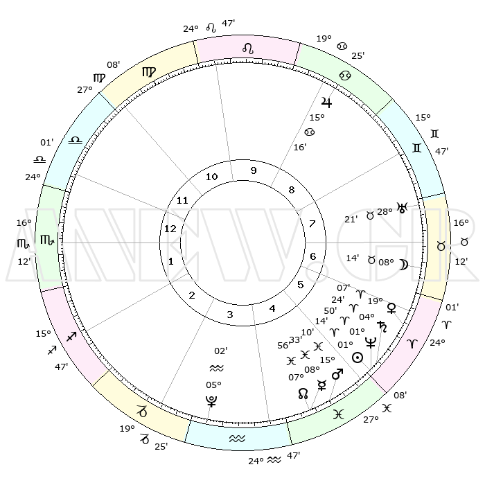 | | ΘΕΣΕΙΣ ΠΛΑΝΗΤΩΝ ΑΣΤΡΟΛΟΓΙΚΟΥ ΧΑΡΤΗ ΤΗΣ ΣΤΙΓΜΗΣ ΑΥΤΗΣ | | | | Πλανήτης | Ζώδιο | Μοίρες | Δεκαήμ. | Σε οίκο | Απόκλιση | | Ακμές των οίκων | | Ηλιος | Κριός | 01°10' | Πρώτο | 5 | 00 N 28 | | 1ος | 26°15' | Ζυγός | | Σελήνη | Ταύρος | 07°15' | Πρώτο | 7 | 18 N 09 | | 2ος | 24°27' | Σκορπιός | | Ερμής | Ιχθείς | 08°32' | Πρώτο | 5 | 07 S 40 | | 3ος | 26°07' | Τοξότης | | Αφροδίτη | Κριός | 19°02' | Δεύτερο | 6 | 06 N 41 | | 4ος | 00°04' | Υδροχόος | | Αρης | Ιχθείς | 15°07' | Δεύτερο | 5 | 06 S 51 | | 5ος | 03°01' | Ιχθείς | | Δίας | Καρκίνος | 15°16' | Δεύτερο | 9 | 22 N 55 | | 6ος | 02°00' | Κριός | | Κρόνος | Κριός | 04°23' | Πρώτο | 6 | 00 S 12 | | 7ος | 26°15' | Κριός | | Ουρανός | Ταύρος | 28°21' | Τρίτο | 8 | 19 N 37 | | 8ος | 24°27' | Ταύρος | | Ποσειδώνας | Κριός | 01°49' | Πρώτο | 5 | 00 S 28 | | 9ος | 26°07' | Δίδυμοι | | Πλούτωνας | Υδροχόος | 05°02' | Πρώτο | 4 | 22 S 48 | | 10ος | 00°04' | Λέων | | Β. Δεσμός | Ιχθείς | 07°57' | Πρώτο | 5 | 08 S 35 | | 11ος | 03°01' | Παρθένος | | Ωροσκόπος | Ζυγός | 26°15' | Τρίτο | | | 12ος | 02°00' | Ζυγός | | Μεσουράνημα | Λέων | 00°04' | Πρώτο | | | |