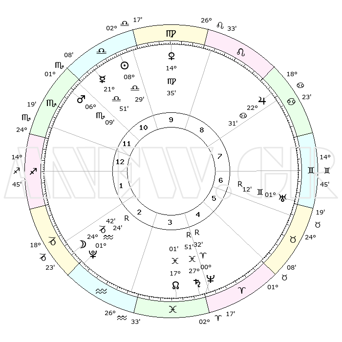 | ΘΕΣΕΙΣ ΠΛΑΝΗΤΩΝ ΑΣΤΡΟΛΟΓΙΚΟΥ ΧΑΡΤΗ ΤΗΣ ΣΤΙΓΜΗΣ ΑΥΤΗΣ | | Πλανήτης | Ζώδιο | Μοίρες | Δεκαήμ. | Σε οίκο | Απόκλιση | | Ακμές των οίκων | Ηλιος | Ζυγός | 08°23' | Πρώτο | 11 | 03 S 20 | | 1ος | 17°33' | Σκορπιός | Σελήνη | Αιγόκερως | 23°32' | Τρίτο | 3 | 25 S 37 | | 2ος | 17°16' | Τοξότης | Ερμής | Ζυγός | 21°42' | Τρίτο | 11 | 08 S 35 | | 3ος | 21°05' | Αιγόκερως | Αφροδίτη | Παρθένος | 14°28' | Δεύτερο | 10 | 07 N 18 | | 4ος | 26°32' | Υδροχόος | Αρης | Σκορπιός | 06°05' | Πρώτο | 12 | 13 S 38 | | 5ος | 28°47' | Ιχθείς | Δίας | Καρκίνος | 22°30' | Τρίτο | 9 | 21 N 35 | | 6ος | 25°30' | Κριός | Κρόνος | Ιχθείς | 27°52'R | Τρίτο | 4 | 03 S 09 | | 7ος | 17°33' | Ταύρος | Ουρανός | Δίδυμοι | 01°12'R | Πρώτο | 7 | 20 N 11 | | 8ος | 17°16' | Δίδυμοι | Ποσειδώνας | Κριός | 00°32'R | Πρώτο | 5 | 01 S 03 | | 9ος | 21°05' | Καρκίνος | Πλούτωνας | Υδροχόος | 01°24'R | Πρώτο | 3 | 23 S 32 | | 10ος | 26°32' | Λέων | Β. Δεσμός | Ιχθείς | 17°01' | Δεύτερο | 4 | 05 S 07 | | 11ος | 28°47' | Παρθένος | Ωροσκόπος | Σκορπιός | 17°33' | Δεύτερο | | | 12ος | 25°30' | Ζυγός | Μεσουράνημα | Λέων | 26°32' | Τρίτο | | | |