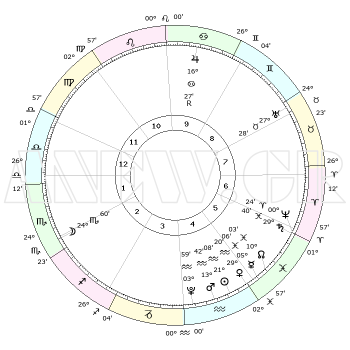| | ΘΕΣΕΙΣ ΠΛΑΝΗΤΩΝ ΑΣΤΡΟΛΟΓΙΚΟΥ ΧΑΡΤΗ ΤΗΣ ΣΤΙΓΜΗΣ ΑΥΤΗΣ | | | | Πλανήτης | Ζώδιο | Μοίρες | Δεκαήμ. | Σε οίκο | Απόκλιση | | Ακμές των οίκων | | Ηλιος | Υδροχόος | 21°04' | Τρίτο | 5 | 14 S 28 | | 1ος | 08°28' | Ζυγός | | Σελήνη | Σκορπιός | 24°17' | Τρίτο | 2 | 23 S 45 | | 2ος | 05°38' | Σκορπιός | | Ερμής | Ιχθείς | 04°60' | Πρώτο | 5 | 10 S 33 | | 3ος | 06°24' | Τοξότης | | Αφροδίτη | Υδροχόος | 29°15' | Τρίτο | 5 | 13 S 05 | | 4ος | 09°32' | Αιγόκερως | | Αρης | Υδροχόος | 13°39' | Δεύτερο | 5 | 17 S 45 | | 5ος | 12°28' | Υδροχόος | | Δίας | Καρκίνος | 16°28'R | Δεύτερο | 10 | 22 N 44 | | 6ος | 12°33' | Ιχθείς | | Κρόνος | Ιχθείς | 29°40' | Τρίτο | 6 | 02 S 07 | | 7ος | 08°29' | Κριός | | Ουρανός | Ταύρος | 27°28' | Τρίτο | 8 | 19 N 25 | | 8ος | 05°38' | Ταύρος | | Ποσειδώνας | Κριός | 00°24' | Πρώτο | 6 | 01 S 03 | | 9ος | 06°24' | Δίδυμοι | | Πλούτωνας | Υδροχόος | 03°59' | Πρώτο | 4 | 22 S 58 | | 10ος | 09°32' | Καρκίνος | | Β. Δεσμός | Ιχθείς | 10°04' | Δεύτερο | 5 | 07 S 48 | | 11ος | 12°28' | Λέων | | Ωροσκόπος | Ζυγός | 08°28' | Πρώτο | | | 12ος | 12°33' | Παρθένος | | Μεσουράνημα | Καρκίνος | 09°32' | Πρώτο | | | |