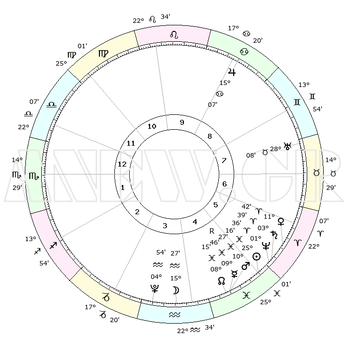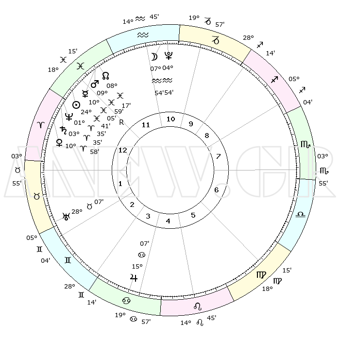 | | ΘΕΣΕΙΣ ΠΛΑΝΗΤΩΝ ΑΣΤΡΟΛΟΓΙΚΟΥ ΧΑΡΤΗ ΤΗΣ ΣΤΙΓΜΗΣ ΑΥΤΗΣ | | | | Πλανήτης | Ζώδιο | Μοίρες | Δεκαήμ. | Σε οίκο | Απόκλιση | | Ακμές των οίκων | | Ηλιος | Ιχθείς | 25°13' | Τρίτο | 5 | 01 S 54 | | 1ος | 00°11' | Σκορπιός | | Σελήνη | Υδροχόος | 14°49' | Δεύτερο | 4 | 18 S 27 | | 2ος | 28°36' | Σκορπιός | | Ερμής | Ιχθείς | 09°47'R | Πρώτο | 5 | 05 S 50 | | 3ος | 00°34' | Αιγόκερως | | Αφροδίτη | Κριός | 11°38' | Δεύτερο | 6 | 03 N 40 | | 4ος | 04°46' | Υδροχόος | | Αρης | Ιχθείς | 10°25' | Δεύτερο | 5 | 08 S 40 | | 5ος | 07°41' | Ιχθείς | | Δίας | Καρκίνος | 15°07' | Δεύτερο | 9 | 22 N 56 | | 6ος | 06°21' | Κριός | | Κρόνος | Κριός | 03°39' | Πρώτο | 5 | 00 S 30 | | 7ος | 00°11' | Ταύρος | | Ουρανός | Ταύρος | 28°08' | Τρίτο | 7 | 19 N 34 | | 8ος | 28°36' | Ταύρος | | Ποσειδώνας | Κριός | 01°36' | Πρώτο | 5 | 00 S 34 | | 9ος | 00°34' | Καρκίνος | | Πλούτωνας | Υδροχόος | 04°54' | Πρώτο | 4 | 22 S 49 | | 10ος | 04°47' | Λέων | | Β. Δεσμός | Ιχθείς | 08°16' | Πρώτο | 5 | 08 S 28 | | 11ος | 07°41' | Παρθένος | | Ωροσκόπος | Σκορπιός | 00°11' | Πρώτο | | | 12ος | 06°21' | Ζυγός | | Μεσουράνημα | Λέων | 04°47' | Πρώτο | | | |