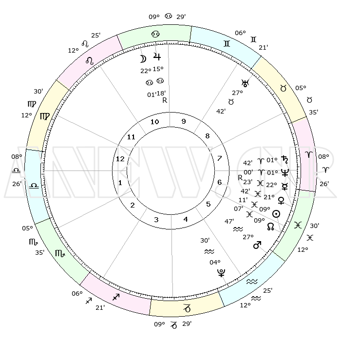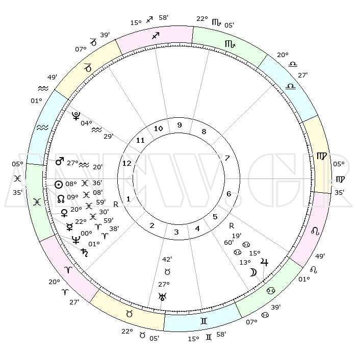 | | ΘΕΣΕΙΣ ΠΛΑΝΗΤΩΝ ΑΣΤΡΟΛΟΓΙΚΟΥ ΧΑΡΤΗ ΤΗΣ ΣΤΙΓΜΗΣ ΑΥΤΗΣ | | | | Πλανήτης | Ζώδιο | Μοίρες | Δεκαήμ. | Σε οίκο | Απόκλιση | | Ακμές των οίκων | | Ηλιος | Ιχθείς | 09°08' | Πρώτο | 6 | 08 S 09 | | 1ος | 22°52' | Παρθένος | | Σελήνη | Καρκίνος | 21°16' | Τρίτο | 10 | 25 N 37 | | 2ος | 18°54' | Ζυγός | | Ερμής | Ιχθείς | 22°24'R | Τρίτο | 6 | 00 S 11 | | 3ος | 19°03' | Σκορπιός | | Αφροδίτη | Ιχθείς | 21°38' | Τρίτο | 6 | 04 S 35 | | 4ος | 21°59' | Τοξότης | | Αρης | Υδροχόος | 27°45' | Τρίτο | 6 | 13 S 17 | | 5ος | 25°05' | Αιγόκερως | | Δίας | Καρκίνος | 15°18'R | Δεύτερο | 10 | 22 N 54 | | 6ος | 25°47' | Υδροχόος | | Κρόνος | Κριός | 01°41' | Πρώτο | 7 | 01 S 17 | | 7ος | 22°52' | Ιχθείς | | Ουρανός | Ταύρος | 27°42' | Τρίτο | 9 | 19 N 28 | | 8ος | 18°54' | Κριός | | Ποσειδώνας | Κριός | 01°00' | Πρώτο | 7 | 00 S 48 | | 9ος | 19°03' | Ταύρος | | Πλούτωνας | Υδροχόος | 04°30' | Πρώτο | 5 | 22 S 53 | | 10ος | 21°59' | Δίδυμοι | | Β. Δεσμός | Ιχθείς | 09°07' | Πρώτο | 6 | 08 S 09 | | 11ος | 25°05' | Καρκίνος | | Ωροσκόπος | Παρθένος | 22°52' | Τρίτο | | | 12ος | 25°47' | Λέων | | Μεσουράνημα | Δίδυμοι | 21°59' | Τρίτο | | | |