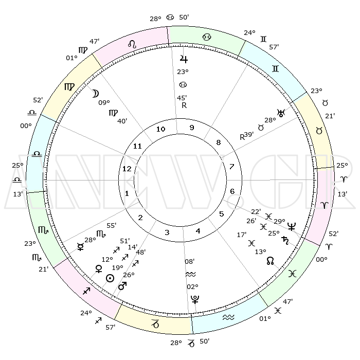 | | ΘΕΣΕΙΣ ΠΛΑΝΗΤΩΝ ΑΣΤΡΟΛΟΓΙΚΟΥ ΧΑΡΤΗ ΤΗΣ ΣΤΙΓΜΗΣ ΑΥΤΗΣ | | | | Πλανήτης | Ζώδιο | Μοίρες | Δεκαήμ. | Σε οίκο | Απόκλιση | | Ακμές των οίκων | | Ηλιος | Τοξότης | 18°39' | Δεύτερο | 9 | 22 S 57 | | 1ος | 05°58' | Κριός | | Σελήνη | Παρθένος | 02°14' | Πρώτο | 6 | 11 N 34 | | 2ος | 14°46' | Ταύρος | | Ερμής | Σκορπιός | 28°15' | Τρίτο | 8 | 17 S 45 | | 3ος | 11°17' | Δίδυμοι | | Αφροδίτη | Τοξότης | 12°08' | Δεύτερο | 9 | 21 S 54 | | 4ος | 03°21' | Καρκίνος | | Αρης | Τοξότης | 26°22' | Τρίτο | 9 | 24 S 07 | | 5ος | 25°57' | Καρκίνος | | Δίας | Καρκίνος | 23°48'R | Τρίτο | 4 | 21 N 31 | | 6ος | 24°18' | Λέων | | Κρόνος | Ιχθείς | 25°25' | Τρίτο | 12 | 03 S 58 | | 7ος | 05°58' | Ζυγός | | Ουρανός | Ταύρος | 28°40'R | Τρίτο | 2 | 19 N 40 | | 8ος | 14°46' | Σκορπιός | | Ποσειδώνας | Ιχθείς | 29°22' | Τρίτο | 12 | 01 S 29 | | 9ος | 11°17' | Τοξότης | | Πλούτωνας | Υδροχόος | 02°08' | Πρώτο | 11 | 23 S 21 | | 10ος | 03°21' | Αιγόκερως | | Β. Δεσμός | Ιχθείς | 13°19' | Δεύτερο | 12 | 06 S 33 | | 11ος | 25°57' | Αιγόκερως | | Ωροσκόπος | Κριός | 05°58' | Πρώτο | | | 12ος | 24°18' | Υδροχόος | | Μεσουράνημα | Αιγόκερως | 03°21' | Πρώτο | | | |