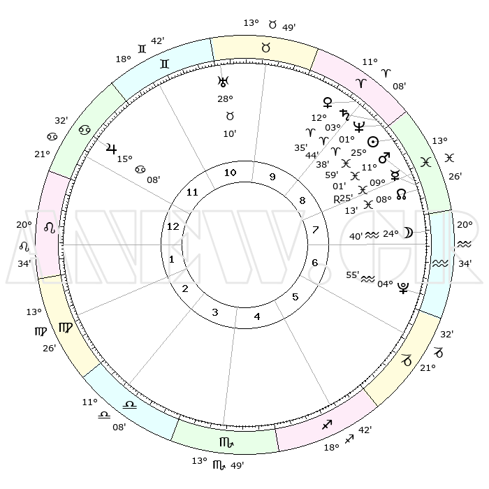 | | ΘΕΣΕΙΣ ΠΛΑΝΗΤΩΝ ΑΣΤΡΟΛΟΓΙΚΟΥ ΧΑΡΤΗ ΤΗΣ ΣΤΙΓΜΗΣ ΑΥΤΗΣ | | | | Πλανήτης | Ζώδιο | Μοίρες | Δεκαήμ. | Σε οίκο | Απόκλιση | | Ακμές των οίκων | | Ηλιος | Ιχθείς | 26°12' | Τρίτο | 5 | 01 S 31 | | 1ος | 26°56' | Ζυγός | | Σελήνη | Υδροχόος | 27°39' | Τρίτο | 4 | 13 S 16 | | 2ος | 25°10' | Σκορπιός | | Ερμής | Ιχθείς | 09°19'R | Πρώτο | 5 | 06 S 14 | | 3ος | 26°53' | Τοξότης | | Αφροδίτη | Κριός | 12°52' | Δεύτερο | 6 | 04 N 10 | | 4ος | 00°53' | Υδροχόος | | Αρης | Ιχθείς | 11°12' | Δεύτερο | 5 | 08 S 22 | | 5ος | 03°49' | Ιχθείς | | Δίας | Καρκίνος | 15°08' | Δεύτερο | 9 | 22 N 56 | | 6ος | 02°45' | Κριός | | Κρόνος | Κριός | 03°46' | Πρώτο | 6 | 00 S 27 | | 7ος | 26°56' | Κριός | | Ουρανός | Ταύρος | 28°10' | Τρίτο | 8 | 19 N 35 | | 8ος | 25°10' | Ταύρος | | Ποσειδώνας | Κριός | 01°38' | Πρώτο | 5 | 00 S 33 | | 9ος | 26°53' | Δίδυμοι | | Πλούτωνας | Υδροχόος | 04°56' | Πρώτο | 4 | 22 S 49 | | 10ος | 00°53' | Λέων | | Β. Δεσμός | Ιχθείς | 08°13' | Πρώτο | 5 | 08 S 29 | | 11ος | 03°49' | Παρθένος | | Ωροσκόπος | Ζυγός | 26°56' | Τρίτο | | | 12ος | 02°45' | Ζυγός | | Μεσουράνημα | Λέων | 00°53' | Πρώτο | | | |