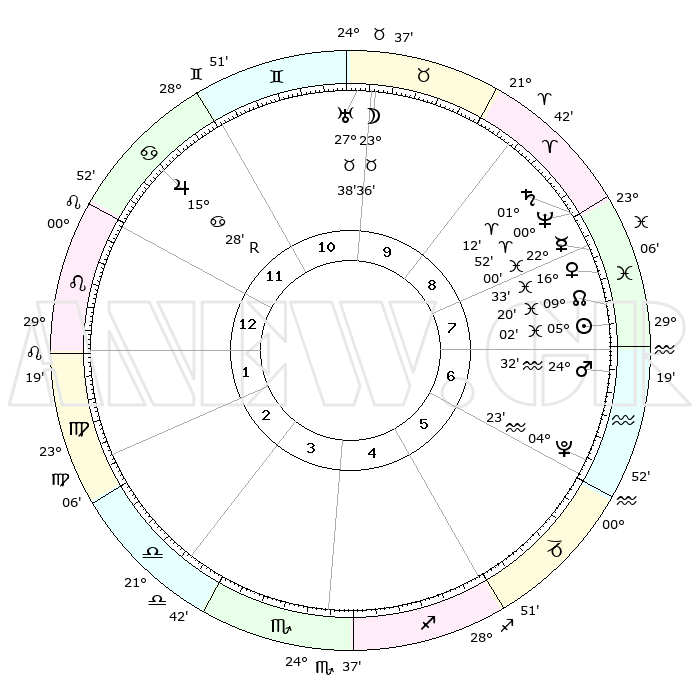 | | ΘΕΣΕΙΣ ΠΛΑΝΗΤΩΝ ΑΣΤΡΟΛΟΓΙΚΟΥ ΧΑΡΤΗ ΤΗΣ ΣΤΙΓΜΗΣ ΑΥΤΗΣ | | | | Πλανήτης | Ζώδιο | Μοίρες | Δεκαήμ. | Σε οίκο | Απόκλιση | | Ακμές των οίκων | | Ηλιος | Ιχθείς | 04°58' | Πρώτο | 8 | 09 S 41 | | 1ος | 11°00' | Λέων | | Σελήνη | Ταύρος | 22°42' | Τρίτο | 10 | 23 N 21 | | 2ος | 02°55' | Παρθένος | | Ερμής | Ιχθείς | 21°58' | Τρίτο | 8 | 01 S 12 | | 3ος | 29°27' | Παρθένος | | Αφροδίτη | Ιχθείς | 16°28' | Δεύτερο | 8 | 06 S 39 | | 4ος | 01°36' | Σκορπιός | | Αρης | Υδροχόος | 24°29' | Τρίτο | 7 | 14 S 23 | | 5ος | 07°09' | Τοξότης | | Δίας | Καρκίνος | 15°29'R | Δεύτερο | 12 | 22 N 52 | | 6ος | 11°09' | Αιγόκερως | | Κρόνος | Κριός | 01°12' | Πρώτο | 9 | 01 S 29 | | 7ος | 11°00' | Υδροχόος | | Ουρανός | Ταύρος | 27°38' | Τρίτο | 10 | 19 N 27 | | 8ος | 02°55' | Ιχθείς | | Ποσειδώνας | Κριός | 00°51' | Πρώτο | 9 | 00 S 52 | | 9ος | 29°27' | Ιχθείς | | Πλούτωνας | Υδροχόος | 04°23' | Πρώτο | 6 | 22 S 54 | | 10ος | 01°36' | Ταύρος | | Β. Δεσμός | Ιχθείς | 09°20' | Πρώτο | 8 | 08 S 04 | | 11ος | 07°09' | Δίδυμοι | | Ωροσκόπος | Λέων | 11°00' | Δεύτερο | | | 12ος | 11°09' | Καρκίνος | | Μεσουράνημα | Ταύρος | 01°36' | Πρώτο | | | |