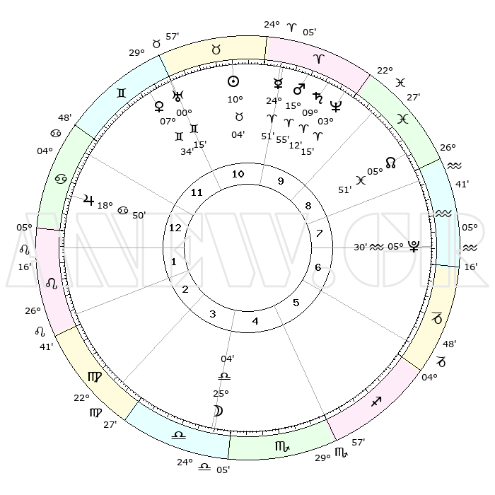 | | ΘΕΣΕΙΣ ΠΛΑΝΗΤΩΝ ΑΣΤΡΟΛΟΓΙΚΟΥ ΧΑΡΤΗ ΤΗΣ ΣΤΙΓΜΗΣ ΑΥΤΗΣ | | | | Πλανήτης | Ζώδιο | Μοίρες | Δεκαήμ. | Σε οίκο | Απόκλιση | | Ακμές των οίκων | | Ηλιος | Ταύρος | 09°11' | Πρώτο | 9 | 14 N 33 | | 1ος | 05°30' | Παρθένος | | Σελήνη | Ζυγός | 14°01' | Δεύτερο | 2 | 08 S 20 | | 2ος | 29°56' | Παρθένος | | Ερμής | Κριός | 23°13' | Τρίτο | 8 | 07 N 05 | | 3ος | 29°04' | Ζυγός | | Αφροδίτη | Δίδυμοι | 06°29' | Πρώτο | 10 | 22 N 12 | | 4ος | 02°01' | Τοξότης | | Αρης | Κριός | 15°14' | Δεύτερο | 8 | 05 N 10 | | 5ος | 05°51' | Αιγόκερως | | Δίας | Καρκίνος | 18°43' | Δεύτερο | 11 | 22 N 31 | | 6ος | 07°25' | Υδροχόος | | Κρόνος | Κριός | 09°05' | Πρώτο | 8 | 01 N 36 | | 7ος | 05°30' | Ιχθείς | | Ουρανός | Δίδυμοι | 00°12' | Πρώτο | 9 | 20 N 01 | | 8ος | 29°56' | Ιχθείς | | Ποσειδώνας | Κριός | 03°13' | Πρώτο | 8 | 00 N 04 | | 9ος | 29°04' | Κριός | | Πλούτωνας | Υδροχόος | 05°30' | Πρώτο | 5 | 22 S 49 | | 10ος | 02°01' | Δίδυμοι | | Β. Δεσμός | Ιχθείς | 05°54' | Πρώτο | 7 | 09 S 21 | | 11ος | 05°51' | Καρκίνος | | Ωροσκόπος | Παρθένος | 05°30' | Πρώτο | | | 12ος | 07°25' | Λέων | | Μεσουράνημα | Δίδυμοι | 02°01' | Πρώτο | | | |