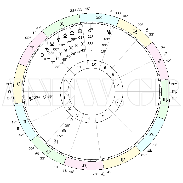 | | ΘΕΣΕΙΣ ΠΛΑΝΗΤΩΝ ΑΣΤΡΟΛΟΓΙΚΟΥ ΧΑΡΤΗ ΤΗΣ ΣΤΙΓΜΗΣ ΑΥΤΗΣ | | | | Πλανήτης | Ζώδιο | Μοίρες | Δεκαήμ. | Σε οίκο | Απόκλιση | | Ακμές των οίκων | | Ηλιος | Ιχθείς | 01°39' | Πρώτο | 12 | 10 S 53 | | 1ος | 11°42' | Κριός | | Σελήνη | Κριός | 06°26' | Πρώτο | 12 | 04 N 48 | | 2ος | 18°59' | Ταύρος | | Ερμής | Ιχθείς | 19°42' | Δεύτερο | 12 | 02 S 52 | | 3ος | 14°42' | Δίδυμοι | | Αφροδίτη | Ιχθείς | 12°21' | Δεύτερο | 12 | 08 S 16 | | 4ος | 06°36' | Καρκίνος | | Αρης | Υδροχόος | 21°53' | Τρίτο | 11 | 15 S 14 | | 5ος | 29°32' | Καρκίνος | | Δίας | Καρκίνος | 15°40'R | Δεύτερο | 4 | 22 N 51 | | 6ος | 28°50' | Λέων | | Κρόνος | Κριός | 00°49' | Πρώτο | 12 | 01 S 38 | | 7ος | 11°42' | Ζυγός | | Ουρανός | Ταύρος | 27°35' | Τρίτο | 2 | 19 N 26 | | 8ος | 18°59' | Σκορπιός | | Ποσειδώνας | Κριός | 00°45' | Πρώτο | 12 | 00 S 54 | | 9ος | 14°42' | Τοξότης | | Πλούτωνας | Υδροχόος | 04°18' | Πρώτο | 11 | 22 S 55 | | 10ος | 06°36' | Αιγόκερως | | Β. Δεσμός | Ιχθείς | 09°30' | Πρώτο | 12 | 08 S 00 | | 11ος | 29°32' | Αιγόκερως | | Ωροσκόπος | Κριός | 11°42' | Δεύτερο | | | 12ος | 28°50' | Υδροχόος | | Μεσουράνημα | Αιγόκερως | 06°36' | Πρώτο | | | |