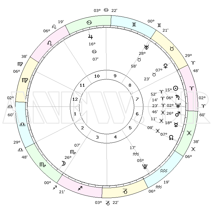 | | ΘΕΣΕΙΣ ΠΛΑΝΗΤΩΝ ΑΣΤΡΟΛΟΓΙΚΟΥ ΧΑΡΤΗ ΤΗΣ ΣΤΙΓΜΗΣ ΑΥΤΗΣ | | | | Πλανήτης | Ζώδιο | Μοίρες | Δεκαήμ. | Σε οίκο | Απόκλιση | | Ακμές των οίκων | | Ηλιος | Κριός | 15°43' | Δεύτερο | 9 | 06 N 11 | | 1ος | 16°04' | Λέων | | Σελήνη | Σκορπιός | 24°12' | Τρίτο | 4 | 23 S 40 | | 2ος | 08°28' | Παρθένος | | Ερμής | Ιχθείς | 18°01' | Δεύτερο | 8 | 06 S 30 | | 3ος | 05°39' | Ζυγός | | Αφροδίτη | Ταύρος | 07°11' | Πρώτο | 9 | 13 N 40 | | 4ος | 08°08' | Σκορπιός | | Αρης | Ιχθείς | 26°38' | Τρίτο | 8 | 02 S 17 | | 5ος | 13°20' | Τοξότης | | Δίας | Καρκίνος | 16°06' | Δεύτερο | 11 | 22 N 50 | | 6ος | 16°41' | Αιγόκερως | | Κρόνος | Κριός | 06°13' | Πρώτο | 9 | 00 N 31 | | 7ος | 16°04' | Υδροχόος | | Ουρανός | Ταύρος | 28°58' | Τρίτο | 10 | 19 N 45 | | 8ος | 08°29' | Ιχθείς | | Ποσειδώνας | Κριός | 02°23' | Πρώτο | 8 | 00 S 15 | | 9ος | 05°39' | Κριός | | Πλούτωνας | Υδροχόος | 05°17' | Πρώτο | 6 | 22 S 47 | | 10ος | 08°08' | Ταύρος | | Β. Δεσμός | Ιχθείς | 07°10' | Πρώτο | 7 | 08 S 53 | | 11ος | 13°20' | Δίδυμοι | | Ωροσκόπος | Λέων | 16°04' | Δεύτερο | | | 12ος | 16°41' | Καρκίνος | | Μεσουράνημα | Ταύρος | 08°08' | Πρώτο | | | |