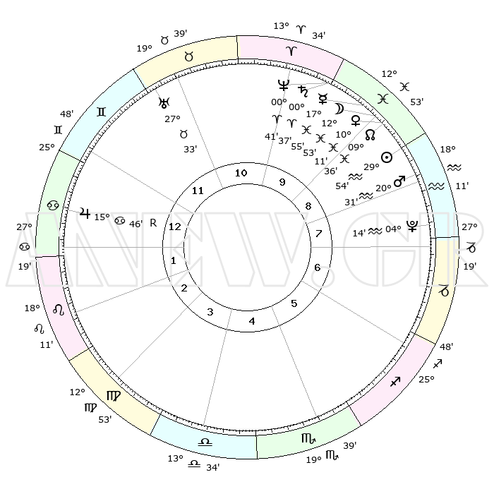 | | ΘΕΣΕΙΣ ΠΛΑΝΗΤΩΝ ΑΣΤΡΟΛΟΓΙΚΟΥ ΧΑΡΤΗ ΤΗΣ ΣΤΙΓΜΗΣ ΑΥΤΗΣ | | | | Πλανήτης | Ζώδιο | Μοίρες | Δεκαήμ. | Σε οίκο | Απόκλιση | | Ακμές των οίκων | | Ηλιος | Υδροχόος | 29°49' | Τρίτο | 9 | 11 S 32 | | 1ος | 04°26' | Καρκίνος | | Σελήνη | Ιχθείς | 11°52' | Δεύτερο | 9 | 06 S 52 | | 2ος | 25°00' | Καρκίνος | | Ερμής | Ιχθείς | 17°50' | Δεύτερο | 10 | 04 S 01 | | 3ος | 17°07' | Λέων | | Αφροδίτη | Ιχθείς | 10°05' | Δεύτερο | 9 | 09 S 08 | | 4ος | 14°10' | Παρθένος | | Αρης | Υδροχόος | 20°28' | Τρίτο | 9 | 15 S 42 | | 5ος | 18°45' | Ζυγός | | Δίας | Καρκίνος | 15°47'R | Δεύτερο | 1 | 22 N 50 | | 6ος | 28°22' | Σκορπιός | | Κρόνος | Κριός | 00°37' | Πρώτο | 10 | 01 S 43 | | 7ος | 04°26' | Αιγόκερως | | Ουρανός | Ταύρος | 27°33' | Τρίτο | 11 | 19 N 26 | | 8ος | 25°00' | Αιγόκερως | | Ποσειδώνας | Κριός | 00°41' | Πρώτο | 10 | 00 S 56 | | 9ος | 17°07' | Υδροχόος | | Πλούτωνας | Υδροχόος | 04°14' | Πρώτο | 8 | 22 S 55 | | 10ος | 14°10' | Ιχθείς | | Β. Δεσμός | Ιχθείς | 09°36' | Πρώτο | 9 | 07 S 58 | | 11ος | 18°45' | Κριός | | Ωροσκόπος | Καρκίνος | 04°26' | Πρώτο | | | 12ος | 28°22' | Ταύρος | | Μεσουράνημα | Ιχθείς | 14°10' | Δεύτερο | | | |