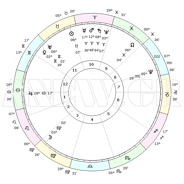 | | ΘΕΣΕΙΣ ΠΛΑΝΗΤΩΝ ΑΣΤΡΟΛΟΓΙΚΟΥ ΧΑΡΤΗ ΤΗΣ ΣΤΙΓΜΗΣ ΑΥΤΗΣ | | | | Πλανήτης | Ζώδιο | Μοίρες | Δεκαήμ. | Σε οίκο | Απόκλιση | | Ακμές των οίκων | | Ηλιος | Ταύρος | 06°03' | Πρώτο | 11 | 13 N 32 | | 1ος | 26°44' | Δίδυμοι | | Σελήνη | Παρθένος | 03°01' | Πρώτο | 3 | 10 N 45 | | 2ος | 17°45' | Καρκίνος | | Ερμής | Κριός | 17°29' | Δεύτερο | 11 | 04 N 42 | | 3ος | 09°21' | Λέων | | Αφροδίτη | Δίδυμοι | 02°34' | Πρώτο | 12 | 21 N 21 | | 4ος | 05°10' | Παρθένος | | Αρης | Κριός | 12°45' | Δεύτερο | 11 | 04 N 11 | | 5ος | 08°34' | Ζυγός | | Δίας | Καρκίνος | 18°17' | Δεύτερο | 2 | 22 N 34 | | 6ος | 18°45' | Σκορπιός | | Κρόνος | Κριός | 08°43' | Πρώτο | 11 | 01 N 28 | | 7ος | 26°44' | Τοξότης | | Ουρανός | Δίδυμοι | 00°01' | Πρώτο | 12 | 19 N 59 | | 8ος | 17°45' | Αιγόκερως | | Ποσειδώνας | Κριός | 03°07' | Πρώτο | 10 | 00 N 02 | | 9ος | 09°21' | Υδροχόος | | Πλούτωνας | Υδροχόος | 05°29' | Πρώτο | 8 | 22 S 48 | | 10ος | 05°10' | Ιχθείς | | Β. Δεσμός | Ιχθείς | 06°04' | Πρώτο | 10 | 09 S 17 | | 11ος | 08°34' | Κριός | | Ωροσκόπος | Δίδυμοι | 26°44' | Τρίτο | | | 12ος | 18°45' | Ταύρος | | Μεσουράνημα | Ιχθείς | 05°10' | Πρώτο | | | |