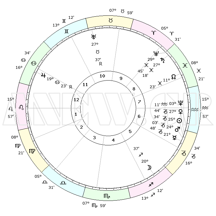| | ΘΕΣΕΙΣ ΠΛΑΝΗΤΩΝ ΑΣΤΡΟΛΟΓΙΚΟΥ ΧΑΡΤΗ ΤΗΣ ΣΤΙΓΜΗΣ ΑΥΤΗΣ | | | | Πλανήτης | Ζώδιο | Μοίρες | Δεκαήμ. | Σε οίκο | Απόκλιση | | Ακμές των οίκων | | Ηλιος | Αιγόκερως | 25°30' | Τρίτο | 6 | 21 S 02 | | 1ος | 27°23' | Καρκίνος | | Σελήνη | Τοξότης | 19°51' | Δεύτερο | 5 | 28 S 05 | | 2ος | 18°15' | Λέων | | Ερμής | Αιγόκερως | 21°42' | Τρίτο | 6 | 23 S 29 | | 3ος | 12°57' | Παρθένος | | Αφροδίτη | Αιγόκερως | 27°39' | Τρίτο | 7 | 21 S 36 | | 4ος | 13°39' | Ζυγός | | Αρης | Αιγόκερως | 23°60' | Τρίτο | 6 | 22 S 16 | | 5ος | 19°44' | Σκορπιός | | Δίας | Καρκίνος | 19°23'R | Δεύτερο | 12 | 22 N 18 | | 6ος | 25°53' | Τοξότης | | Κρόνος | Ιχθείς | 27°18' | Τρίτο | 9 | 03 S 06 | | 7ος | 27°23' | Αιγόκερως | | Ουρανός | Ταύρος | 27°37'R | Τρίτο | 11 | 19 N 26 | | 8ος | 18°15' | Υδροχόος | | Ποσειδώνας | Ιχθείς | 29°45' | Τρίτο | 9 | 01 S 19 | | 9ος | 12°57' | Ιχθείς | | Πλούτωνας | Υδροχόος | 03°11' | Πρώτο | 7 | 23 S 07 | | 10ος | 13°39' | Κριός | | Β. Δεσμός | Ιχθείς | 11°24' | Δεύτερο | 8 | 07 S 17 | | 11ος | 19°44' | Ταύρος | | Ωροσκόπος | Καρκίνος | 27°23' | Τρίτο | | | 12ος | 25°53' | Δίδυμοι | | Μεσουράνημα | Κριός | 13°39' | Δεύτερο | | | |