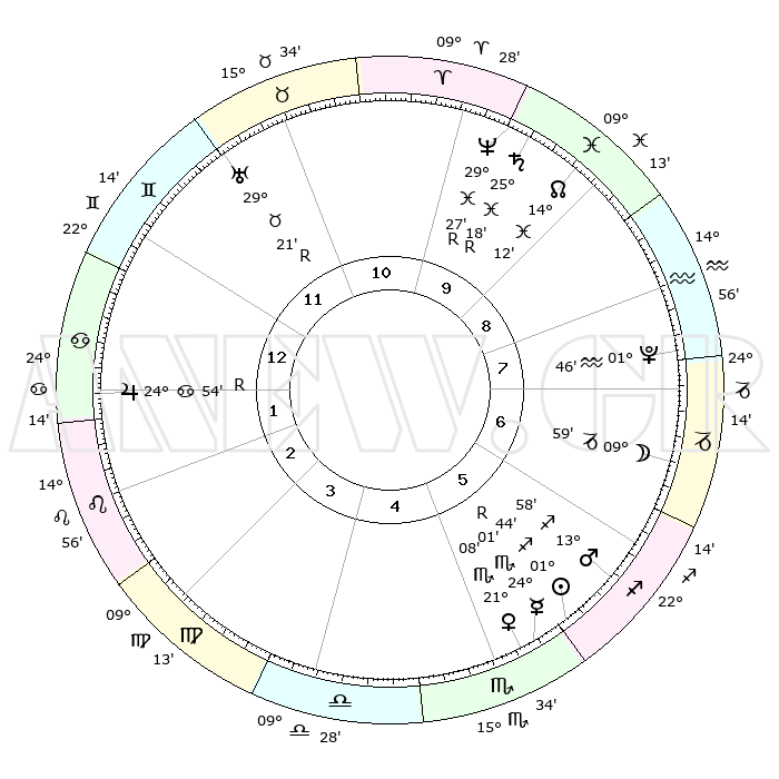 | | ΘΕΣΕΙΣ ΠΛΑΝΗΤΩΝ ΑΣΤΡΟΛΟΓΙΚΟΥ ΧΑΡΤΗ ΤΗΣ ΣΤΙΓΜΗΣ ΑΥΤΗΣ | | | | Πλανήτης | Ζώδιο | Μοίρες | Δεκαήμ. | Σε οίκο | Απόκλιση | | Ακμές των οίκων | | Ηλιος | Τοξότης | 01°41' | Πρώτο | 6 | 20 S 29 | | 1ος | 06°25' | Καρκίνος | | Σελήνη | Αιγόκερως | 09°16' | Πρώτο | 7 | 27 S 39 | | 2ος | 26°55' | Καρκίνος | | Ερμής | Σκορπιός | 24°05'R | Τρίτο | 5 | 17 S 16 | | 3ος | 19°12' | Λέων | | Αφροδίτη | Σκορπιός | 21°04' | Τρίτο | 5 | 17 S 06 | | 4ος | 16°34' | Παρθένος | | Αρης | Τοξότης | 13°56' | Δεύτερο | 6 | 23 S 04 | | 5ος | 21°26' | Ζυγός | | Δίας | Καρκίνος | 24°55'R | Τρίτο | 1 | 21 N 17 | | 6ος | 00°50' | Τοξότης | | Κρόνος | Ιχθείς | 25°18'R | Τρίτο | 10 | 04 S 04 | | 7ος | 06°25' | Αιγόκερως | | Ουρανός | Ταύρος | 29°21'R | Τρίτο | 11 | 19 N 48 | | 8ος | 26°55' | Αιγόκερως | | Ποσειδώνας | Ιχθείς | 29°27'R | Τρίτο | 10 | 01 S 28 | | 9ος | 19°12' | Υδροχόος | | Πλούτωνας | Υδροχόος | 01°45' | Πρώτο | 8 | 23 S 26 | | 10ος | 16°34' | Ιχθείς | | Β. Δεσμός | Ιχθείς | 14°12' | Δεύτερο | 9 | 06 S 13 | | 11ος | 21°26' | Κριός | | Ωροσκόπος | Καρκίνος | 06°25' | Πρώτο | | | 12ος | 00°50' | Δίδυμοι | | Μεσουράνημα | Ιχθείς | 16°34' | Δεύτερο | | | |