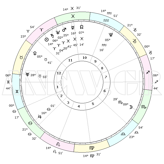 | | ΘΕΣΕΙΣ ΠΛΑΝΗΤΩΝ ΑΣΤΡΟΛΟΓΙΚΟΥ ΧΑΡΤΗ ΤΗΣ ΣΤΙΓΜΗΣ ΑΥΤΗΣ | | | | Πλανήτης | Ζώδιο | Μοίρες | Δεκαήμ. | Σε οίκο | Απόκλιση | | Ακμές των οίκων | | Ηλιος | Κριός | 14°27' | Δεύτερο | 12 | 05 N 42 | | 1ος | 03°25' | Ταύρος | | Σελήνη | Σκορπιός | 08°37' | Πρώτο | 7 | 18 S 37 | | 2ος | 04°42' | Δίδυμοι | | Ερμής | Ιχθείς | 16°41' | Δεύτερο | 11 | 06 S 53 | | 3ος | 27°55' | Δίδυμοι | | Αφροδίτη | Ταύρος | 05°36' | Πρώτο | 1 | 13 N 06 | | 4ος | 19°38' | Καρκίνος | | Αρης | Ιχθείς | 25°38' | Τρίτο | 12 | 02 S 41 | | 5ος | 14°23' | Λέων | | Δίας | Καρκίνος | 16°00' | Δεύτερο | 3 | 22 N 51 | | 6ος | 17°46' | Παρθένος | | Κρόνος | Κριός | 06°04' | Πρώτο | 12 | 00 N 27 | | 7ος | 03°25' | Σκορπιός | | Ουρανός | Ταύρος | 28°54' | Τρίτο | 1 | 19 N 45 | | 8ος | 04°42' | Τοξότης | | Ποσειδώνας | Κριός | 02°20' | Πρώτο | 12 | 00 S 17 | | 9ος | 27°55' | Τοξότης | | Πλούτωνας | Υδροχόος | 05°16' | Πρώτο | 10 | 22 S 47 | | 10ος | 19°38' | Αιγόκερως | | Β. Δεσμός | Ιχθείς | 07°14' | Πρώτο | 11 | 08 S 51 | | 11ος | 14°23' | Υδροχόος | | Ωροσκόπος | Ταύρος | 03°25' | Πρώτο | | | 12ος | 17°46' | Ιχθείς | | Μεσουράνημα | Αιγόκερως | 19°38' | Δεύτερο | | | |