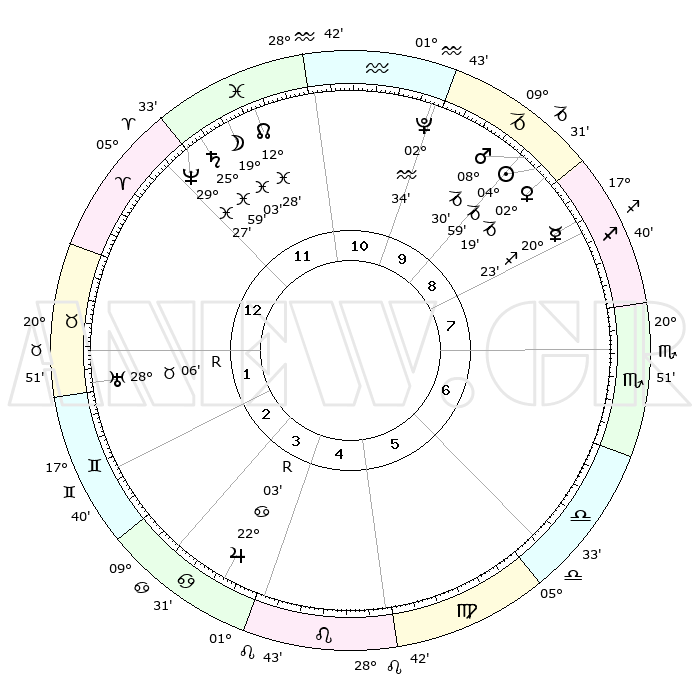 | | ΘΕΣΕΙΣ ΠΛΑΝΗΤΩΝ ΑΣΤΡΟΛΟΓΙΚΟΥ ΧΑΡΤΗ ΤΗΣ ΣΤΙΓΜΗΣ ΑΥΤΗΣ | | | | Πλανήτης | Ζώδιο | Μοίρες | Δεκαήμ. | Σε οίκο | Απόκλιση | | Ακμές των οίκων | | Ηλιος | Αιγόκερως | 04°54' | Πρώτο | 10 | 23 S 21 | | 1ος | 07°09' | Κριός | | Σελήνη | Ιχθείς | 17°58' | Δεύτερο | 12 | 04 S 12 | | 2ος | 15°39' | Ταύρος | | Ερμής | Τοξότης | 20°16' | Τρίτο | 9 | 23 S 00 | | 3ος | 11°60' | Δίδυμοι | | Αφροδίτη | Αιγόκερως | 02°13' | Πρώτο | 9 | 23 S 42 | | 4ος | 04°01' | Καρκίνος | | Αρης | Αιγόκερως | 08°27' | Πρώτο | 10 | 24 S 01 | | 5ος | 26°41' | Καρκίνος | | Δίας | Καρκίνος | 22°04'R | Τρίτο | 4 | 21 N 51 | | 6ος | 25°14' | Λέων | | Κρόνος | Ιχθείς | 25°59' | Τρίτο | 12 | 03 S 41 | | 7ος | 07°09' | Ζυγός | | Ουρανός | Ταύρος | 28°06'R | Τρίτο | 2 | 19 N 32 | | 8ος | 15°39' | Σκορπιός | | Ποσειδώνας | Ιχθείς | 29°27' | Τρίτο | 12 | 01 S 27 | | 9ος | 11°60' | Τοξότης | | Πλούτωνας | Υδροχόος | 02°33' | Πρώτο | 11 | 23 S 15 | | 10ος | 04°01' | Αιγόκερως | | Β. Δεσμός | Ιχθείς | 12°28' | Δεύτερο | 12 | 06 S 53 | | 11ος | 26°41' | Αιγόκερως | | Ωροσκόπος | Κριός | 07°09' | Πρώτο | | | 12ος | 25°14' | Υδροχόος | | Μεσουράνημα | Αιγόκερως | 04°01' | Πρώτο | | | |
