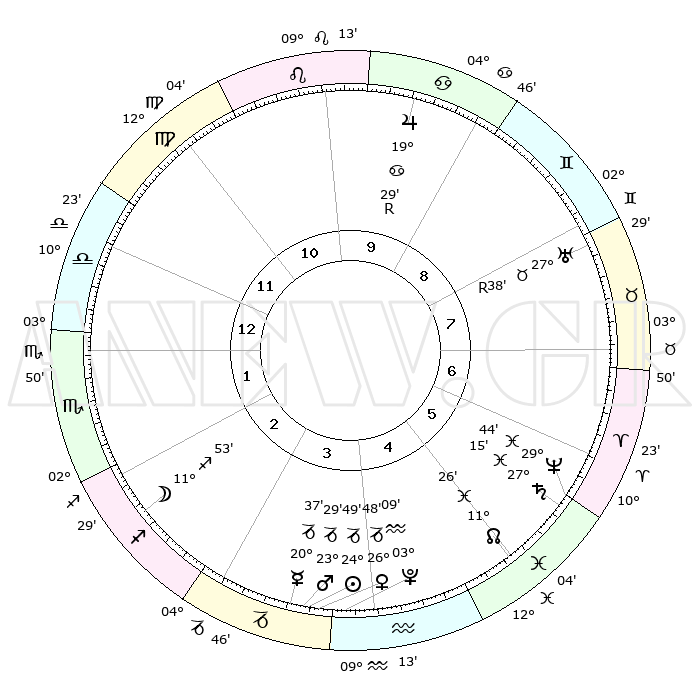 | | ΘΕΣΕΙΣ ΠΛΑΝΗΤΩΝ ΑΣΤΡΟΛΟΓΙΚΟΥ ΧΑΡΤΗ ΤΗΣ ΣΤΙΓΜΗΣ ΑΥΤΗΣ | | | | Πλανήτης | Ζώδιο | Μοίρες | Δεκαήμ. | Σε οίκο | Απόκλιση | | Ακμές των οίκων | | Ηλιος | Αιγόκερως | 24°45' | Τρίτο | 4 | 21 S 10 | | 1ος | 12°07' | Ζυγός | | Σελήνη | Τοξότης | 10°60' | Δεύτερο | 3 | 27 S 09 | | 2ος | 09°29' | Σκορπιός | | Ερμής | Αιγόκερως | 20°30' | Τρίτο | 4 | 23 S 38 | | 3ος | 10°24' | Τοξότης | | Αφροδίτη | Αιγόκερως | 26°43' | Τρίτο | 4 | 21 S 46 | | 4ος | 13°39' | Αιγόκερως | | Αρης | Αιγόκερως | 23°25' | Τρίτο | 4 | 22 S 21 | | 5ος | 16°35' | Υδροχόος | | Δίας | Καρκίνος | 19°29'R | Δεύτερο | 10 | 22 N 17 | | 6ος | 16°30' | Ιχθείς | | Κρόνος | Ιχθείς | 27°14' | Τρίτο | 6 | 03 S 08 | | 7ος | 12°07' | Κριός | | Ουρανός | Ταύρος | 27°38'R | Τρίτο | 8 | 19 N 26 | | 8ος | 09°29' | Ταύρος | | Ποσειδώνας | Ιχθείς | 29°44' | Τρίτο | 6 | 01 S 19 | | 9ος | 10°24' | Δίδυμοι | | Πλούτωνας | Υδροχόος | 03°09' | Πρώτο | 4 | 23 S 08 | | 10ος | 13°39' | Καρκίνος | | Β. Δεσμός | Ιχθείς | 11°26' | Δεύτερο | 5 | 07 S 17 | | 11ος | 16°35' | Λέων | | Ωροσκόπος | Ζυγός | 12°07' | Δεύτερο | | | 12ος | 16°30' | Παρθένος | | Μεσουράνημα | Καρκίνος | 13°39' | Δεύτερο | | | |