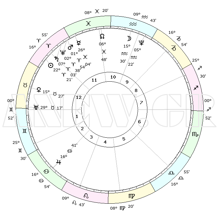 | | ΘΕΣΕΙΣ ΠΛΑΝΗΤΩΝ ΑΣΤΡΟΛΟΓΙΚΟΥ ΧΑΡΤΗ ΤΗΣ ΣΤΙΓΜΗΣ ΑΥΤΗΣ | | | | Πλανήτης | Ζώδιο | Μοίρες | Δεκαήμ. | Σε οίκο | Απόκλιση | | Ακμές των οίκων | | Ηλιος | Κριός | 22°17' | Τρίτο | 12 | 08 N 40 | | 1ος | 24°57' | Κριός | | Σελήνη | Υδροχόος | 14°34' | Δεύτερο | 11 | 18 S 26 | | 2ος | 28°34' | Ταύρος | | Ερμής | Ιχθείς | 25°58' | Τρίτο | 12 | 03 S 52 | | 3ος | 22°40' | Δίδυμοι | | Αφροδίτη | Ταύρος | 15°22' | Δεύτερο | 1 | 16 N 29 | | 4ος | 14°22' | Καρκίνος | | Αρης | Κριός | 01°51' | Πρώτο | 12 | 00 S 11 | | 5ος | 08°17' | Λέων | | Δίας | Καρκίνος | 16°41' | Δεύτερο | 4 | 22 N 46 | | 6ος | 10°01' | Παρθένος | | Κρόνος | Κριός | 07°02' | Πρώτο | 12 | 00 N 50 | | 7ος | 24°57' | Ζυγός | | Ουρανός | Ταύρος | 29°17' | Τρίτο | 2 | 19 N 50 | | 8ος | 28°34' | Σκορπιός | | Ποσειδώνας | Κριός | 02°37' | Πρώτο | 12 | 00 S 10 | | 9ος | 22°40' | Τοξότης | | Πλούτωνας | Υδροχόος | 05°22' | Πρώτο | 10 | 22 S 47 | | 10ος | 14°22' | Αιγόκερως | | Β. Δεσμός | Ιχθείς | 06°49' | Πρώτο | 11 | 09 S 01 | | 11ος | 08°17' | Υδροχόος | | Ωροσκόπος | Κριός | 24°57' | Τρίτο | | | 12ος | 10°01' | Ιχθείς | | Μεσουράνημα | Αιγόκερως | 14°22' | Δεύτερο | | | |