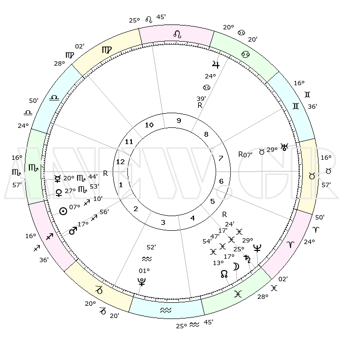 | | ΘΕΣΕΙΣ ΠΛΑΝΗΤΩΝ ΑΣΤΡΟΛΟΓΙΚΟΥ ΧΑΡΤΗ ΤΗΣ ΣΤΙΓΜΗΣ ΑΥΤΗΣ | | | | Πλανήτης | Ζώδιο | Μοίρες | Δεκαήμ. | Σε οίκο | Απόκλιση | | Ακμές των οίκων | | Ηλιος | Τοξότης | 07°04' | Πρώτο | 2 | 21 S 29 | | 1ος | 15°01' | Ζυγός | | Σελήνη | Ιχθείς | 16°19' | Δεύτερο | 5 | 05 S 15 | | 2ος | 12°34' | Σκορπιός | | Ερμής | Σκορπιός | 20°45'R | Τρίτο | 2 | 15 S 32 | | 3ος | 13°36' | Τοξότης | | Αφροδίτη | Σκορπιός | 27°45' | Τρίτο | 2 | 18 S 54 | | 4ος | 16°58' | Αιγόκερως | | Αρης | Τοξότης | 17°51' | Δεύτερο | 3 | 23 S 31 | | 5ος | 19°54' | Υδροχόος | | Δίας | Καρκίνος | 24°39'R | Τρίτο | 10 | 21 N 20 | | 6ος | 19°40' | Ιχθείς | | Κρόνος | Ιχθείς | 25°17' | Τρίτο | 6 | 04 S 03 | | 7ος | 15°01' | Κριός | | Ουρανός | Ταύρος | 29°08'R | Τρίτο | 8 | 19 N 45 | | 8ος | 12°34' | Ταύρος | | Ποσειδώνας | Ιχθείς | 29°24'R | Τρίτο | 6 | 01 S 29 | | 9ος | 13°36' | Δίδυμοι | | Πλούτωνας | Υδροχόος | 01°52' | Πρώτο | 4 | 23 S 25 | | 10ος | 16°58' | Καρκίνος | | Β. Δεσμός | Ιχθείς | 13°55' | Δεύτερο | 5 | 06 S 20 | | 11ος | 19°54' | Λέων | | Ωροσκόπος | Ζυγός | 15°01' | Δεύτερο | | | 12ος | 19°40' | Παρθένος | | Μεσουράνημα | Καρκίνος | 16°58' | Δεύτερο | | | |