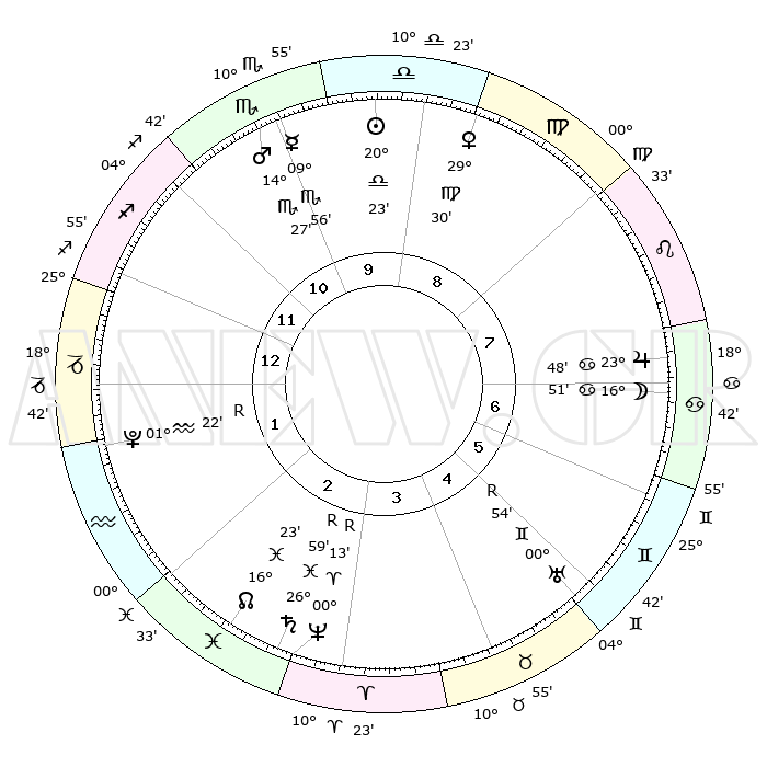 | ΘΕΣΕΙΣ ΠΛΑΝΗΤΩΝ ΑΣΤΡΟΛΟΓΙΚΟΥ ΧΑΡΤΗ ΤΗΣ ΣΤΙΓΜΗΣ ΑΥΤΗΣ | | Πλανήτης | Ζώδιο | Μοίρες | Δεκαήμ. | Σε οίκο | Απόκλιση | | Ακμές των οίκων | Ηλιος | Ζυγός | 20°17' | Τρίτο | 10 | 07 S 56 | | 1ος | 14°60' | Τοξότης | Σελήνη | Καρκίνος | 15°28' | Δεύτερο | 7 | 27 N 08 | | 2ος | 18°41' | Αιγόκερως | Ερμής | Σκορπιός | 09°48' | Πρώτο | 11 | 16 S 13 | | 3ος | 26°53' | Υδροχόος | Αφροδίτη | Παρθένος | 29°23' | Τρίτο | 9 | 01 N 37 | | 4ος | 02°37' | Κριός | Αρης | Σκορπιός | 14°23' | Δεύτερο | 11 | 16 S 21 | | 5ος | 01°25' | Ταύρος | Δίας | Καρκίνος | 23°47' | Τρίτο | 8 | 21 N 23 | | 6ος | 24°34' | Ταύρος | Κρόνος | Ιχθείς | 26°60'R | Τρίτο | 3 | 03 S 30 | | 7ος | 14°60' | Δίδυμοι | Ουρανός | Δίδυμοι | 00°54'R | Πρώτο | 6 | 20 N 08 | | 8ος | 18°41' | Καρκίνος | Ποσειδώνας | Κριός | 00°13'R | Πρώτο | 3 | 01 S 10 | | 9ος | 26°53' | Λέων | Πλούτωνας | Υδροχόος | 01°22'R | Πρώτο | 2 | 23 S 32 | | 10ος | 02°37' | Ζυγός | Β. Δεσμός | Ιχθείς | 16°23' | Δεύτερο | 3 | 05 S 22 | | 11ος | 01°25' | Σκορπιός | Ωροσκόπος | Τοξότης | 14°60' | Δεύτερο | | | 12ος | 24°34' | Σκορπιός | Μεσουράνημα | Ζυγός | 02°37' | Πρώτο | | | |