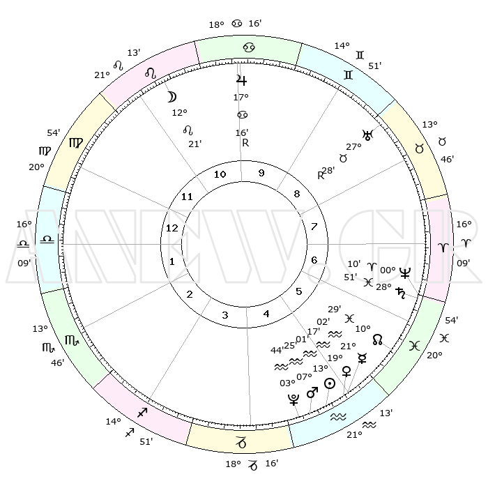 | | ΘΕΣΕΙΣ ΠΛΑΝΗΤΩΝ ΑΣΤΡΟΛΟΓΙΚΟΥ ΧΑΡΤΗ ΤΗΣ ΣΤΙΓΜΗΣ ΑΥΤΗΣ | | | | Πλανήτης | Ζώδιο | Μοίρες | Δεκαήμ. | Σε οίκο | Απόκλιση | | Ακμές των οίκων | | Ηλιος | Υδροχόος | 12°57' | Δεύτερο | 5 | 16 S 55 | | 1ος | 27°56' | Παρθένος | | Σελήνη | Λέων | 11°28' | Δεύτερο | 11 | 19 N 40 | | 2ος | 24°22' | Ζυγός | | Ερμής | Υδροχόος | 20°55' | Τρίτο | 5 | 16 S 15 | | 3ος | 24°44' | Σκορπιός | | Αφροδίτη | Υδροχόος | 19°12' | Δεύτερο | 5 | 16 S 22 | | 4ος | 27°41' | Τοξότης | | Αρης | Υδροχόος | 07°22' | Πρώτο | 5 | 19 S 26 | | 5ος | 00°41' | Υδροχόος | | Δίας | Καρκίνος | 17°16'R | Δεύτερο | 10 | 22 N 37 | | 6ος | 01°12' | Ιχθείς | | Κρόνος | Ιχθείς | 28°50' | Τρίτο | 7 | 02 S 27 | | 7ος | 27°56' | Ιχθείς | | Ουρανός | Ταύρος | 27°28'R | Τρίτο | 9 | 19 N 24 | | 8ος | 24°22' | Κριός | | Ποσειδώνας | Κριός | 00°10' | Πρώτο | 7 | 01 S 08 | | 9ος | 24°44' | Ταύρος | | Πλούτωνας | Υδροχόος | 03°44' | Πρώτο | 5 | 23 S 01 | | 10ος | 27°41' | Δίδυμοι | | Β. Δεσμός | Ιχθείς | 10°29' | Δεύτερο | 6 | 07 S 38 | | 11ος | 00°41' | Λέων | | Ωροσκόπος | Παρθένος | 27°56' | Τρίτο | | | 12ος | 01°12' | Παρθένος | | Μεσουράνημα | Δίδυμοι | 27°41' | Τρίτο | | | |