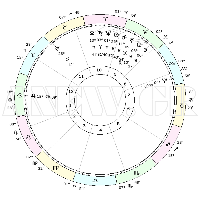 | | ΘΕΣΕΙΣ ΠΛΑΝΗΤΩΝ ΑΣΤΡΟΛΟΓΙΚΟΥ ΧΑΡΤΗ ΤΗΣ ΣΤΙΓΜΗΣ ΑΥΤΗΣ | | | | Πλανήτης | Ζώδιο | Μοίρες | Δεκαήμ. | Σε οίκο | Απόκλιση | | Ακμές των οίκων | | Ηλιος | Ιχθείς | 26°47' | Τρίτο | 10 | 01 S 17 | | 1ος | 25°58' | Δίδυμοι | | Σελήνη | Ιχθείς | 05°30' | Πρώτο | 10 | 09 S 47 | | 2ος | 17°02' | Καρκίνος | | Ερμής | Ιχθείς | 09°06'R | Πρώτο | 10 | 06 S 27 | | 3ος | 08°36' | Λέων | | Αφροδίτη | Κριός | 13°35' | Δεύτερο | 11 | 04 N 28 | | 4ος | 04°18' | Παρθένος | | Αρης | Ιχθείς | 11°39' | Δεύτερο | 10 | 08 S 11 | | 5ος | 07°34' | Ζυγός | | Δίας | Καρκίνος | 15°09' | Δεύτερο | 1 | 22 N 56 | | 6ος | 17°47' | Σκορπιός | | Κρόνος | Κριός | 03°50' | Πρώτο | 10 | 00 S 25 | | 7ος | 25°58' | Τοξότης | | Ουρανός | Ταύρος | 28°12' | Τρίτο | 12 | 19 N 35 | | 8ος | 17°02' | Αιγόκερως | | Ποσειδώνας | Κριός | 01°39' | Πρώτο | 10 | 00 S 32 | | 9ος | 08°36' | Υδροχόος | | Πλούτωνας | Υδροχόος | 04°56' | Πρώτο | 8 | 22 S 49 | | 10ος | 04°18' | Ιχθείς | | Β. Δεσμός | Ιχθείς | 08°11' | Πρώτο | 10 | 08 S 30 | | 11ος | 07°34' | Κριός | | Ωροσκόπος | Δίδυμοι | 25°58' | Τρίτο | | | 12ος | 17°47' | Ταύρος | | Μεσουράνημα | Ιχθείς | 04°18' | Πρώτο | | | |
