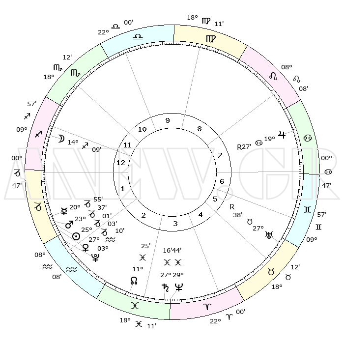 | | ΘΕΣΕΙΣ ΠΛΑΝΗΤΩΝ ΑΣΤΡΟΛΟΓΙΚΟΥ ΧΑΡΤΗ ΤΗΣ ΣΤΙΓΜΗΣ ΑΥΤΗΣ | | | | Πλανήτης | Ζώδιο | Μοίρες | Δεκαήμ. | Σε οίκο | Απόκλιση | | Ακμές των οίκων | | Ηλιος | Αιγόκερως | 24°52' | Τρίτο | 3 | 21 S 09 | | 1ος | 18°31' | Σκορπιός | | Σελήνη | Τοξότης | 12°29' | Δεύτερο | 1 | 27 S 22 | | 2ος | 18°19' | Τοξότης | | Ερμής | Αιγόκερως | 20°42' | Τρίτο | 2 | 23 S 36 | | 3ος | 22°15' | Αιγόκερως | | Αφροδίτη | Αιγόκερως | 26°52' | Τρίτο | 3 | 21 S 44 | | 4ος | 27°46' | Υδροχόος | | Αρης | Αιγόκερως | 23°31' | Τρίτο | 3 | 22 S 21 | | 5ος | 29°57' | Ιχθείς | | Δίας | Καρκίνος | 19°28'R | Δεύτερο | 8 | 22 N 17 | | 6ος | 26°33' | Κριός | | Κρόνος | Ιχθείς | 27°15' | Τρίτο | 4 | 03 S 08 | | 7ος | 18°31' | Ταύρος | | Ουρανός | Ταύρος | 27°38'R | Τρίτο | 7 | 19 N 26 | | 8ος | 18°19' | Δίδυμοι | | Ποσειδώνας | Ιχθείς | 29°44' | Τρίτο | 4 | 01 S 19 | | 9ος | 22°15' | Καρκίνος | | Πλούτωνας | Υδροχόος | 03°10' | Πρώτο | 3 | 23 S 08 | | 10ος | 27°46' | Λέων | | Β. Δεσμός | Ιχθείς | 11°26' | Δεύτερο | 4 | 07 S 17 | | 11ος | 29°57' | Παρθένος | | Ωροσκόπος | Σκορπιός | 18°31' | Δεύτερο | | | 12ος | 26°33' | Ζυγός | | Μεσουράνημα | Λέων | 27°46' | Τρίτο | | | |