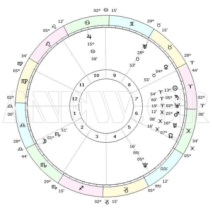 | | ΘΕΣΕΙΣ ΠΛΑΝΗΤΩΝ ΑΣΤΡΟΛΟΓΙΚΟΥ ΧΑΡΤΗ ΤΗΣ ΣΤΙΓΜΗΣ ΑΥΤΗΣ | | | | Πλανήτης | Ζώδιο | Μοίρες | Δεκαήμ. | Σε οίκο | Απόκλιση | | Ακμές των οίκων | | Ηλιος | Κριός | 13°50' | Δεύτερο | 8 | 05 N 27 | | 1ος | 12°10' | Παρθένος | | Σελήνη | Σκορπιός | 01°02' | Πρώτο | 2 | 15 S 40 | | 2ος | 07°15' | Ζυγός | | Ερμής | Ιχθείς | 16°04' | Δεύτερο | 7 | 07 S 03 | | 3ος | 06°50' | Σκορπιός | | Αφροδίτη | Ταύρος | 04°50' | Πρώτο | 8 | 12 N 49 | | 4ος | 09°47' | Τοξότης | | Αρης | Ιχθείς | 25°09' | Τρίτο | 7 | 02 S 53 | | 5ος | 13°16' | Αιγόκερως | | Δίας | Καρκίνος | 15°58' | Δεύτερο | 11 | 22 N 51 | | 6ος | 14°27' | Υδροχόος | | Κρόνος | Κριός | 05°59' | Πρώτο | 7 | 00 N 25 | | 7ος | 12°10' | Ιχθείς | | Ουρανός | Ταύρος | 28°53' | Τρίτο | 9 | 19 N 44 | | 8ος | 07°15' | Κριός | | Ποσειδώνας | Κριός | 02°18' | Πρώτο | 7 | 00 S 17 | | 9ος | 06°50' | Ταύρος | | Πλούτωνας | Υδροχόος | 05°15' | Πρώτο | 5 | 22 S 47 | | 10ος | 09°47' | Δίδυμοι | | Β. Δεσμός | Ιχθείς | 07°16' | Πρώτο | 6 | 08 S 50 | | 11ος | 13°16' | Καρκίνος | | Ωροσκόπος | Παρθένος | 12°10' | Δεύτερο | | | 12ος | 14°27' | Λέων | | Μεσουράνημα | Δίδυμοι | 09°47' | Πρώτο | | | |