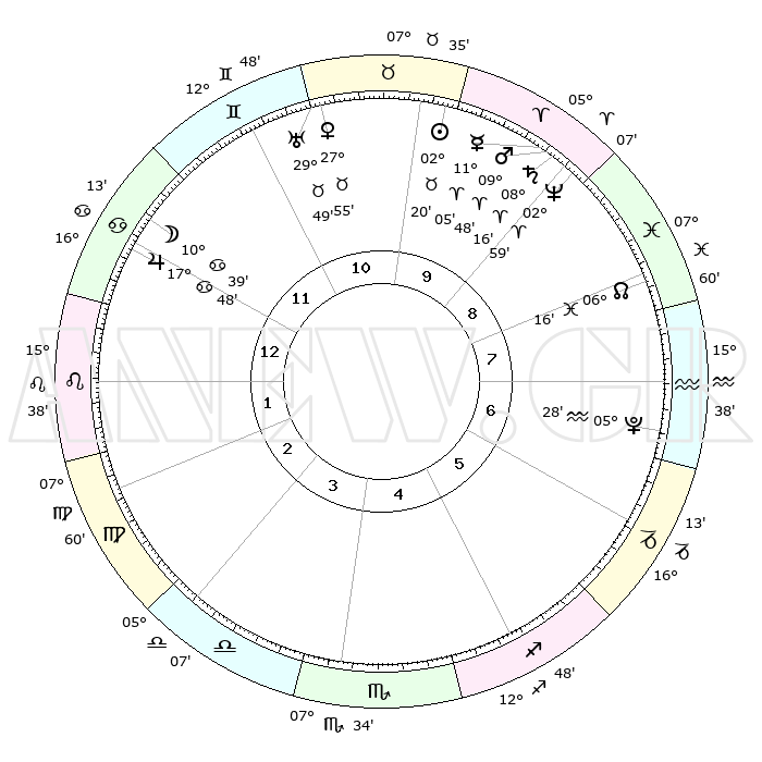 | | ΘΕΣΕΙΣ ΠΛΑΝΗΤΩΝ ΑΣΤΡΟΛΟΓΙΚΟΥ ΧΑΡΤΗ ΤΗΣ ΣΤΙΓΜΗΣ ΑΥΤΗΣ | | | | Πλανήτης | Ζώδιο | Μοίρες | Δεκαήμ. | Σε οίκο | Απόκλιση | | Ακμές των οίκων | | Ηλιος | Ταύρος | 02°16' | Πρώτο | 10 | 12 N 15 | | 1ος | 27°03' | Καρκίνος | | Σελήνη | Καρκίνος | 09°45' | Πρώτο | 12 | 27 N 23 | | 2ος | 17°55' | Λέων | | Ερμής | Κριός | 10°59' | Δεύτερο | 9 | 01 N 59 | | 3ος | 12°34' | Παρθένος | | Αφροδίτη | Ταύρος | 27°50' | Τρίτο | 11 | 20 N 10 | | 4ος | 13°13' | Ζυγός | | Αρης | Κριός | 09°45' | Πρώτο | 9 | 03 N 00 | | 5ος | 19°18' | Σκορπιός | | Δίας | Καρκίνος | 17°48' | Δεύτερο | 12 | 22 N 38 | | 6ος | 25°30' | Τοξότης | | Κρόνος | Κριός | 08°16' | Πρώτο | 9 | 01 N 18 | | 7ος | 27°03' | Αιγόκερως | | Ουρανός | Ταύρος | 29°48' | Τρίτο | 11 | 19 N 57 | | 8ος | 17°55' | Υδροχόος | | Ποσειδώνας | Κριός | 02°59' | Πρώτο | 9 | 00 S 01 | | 9ος | 12°34' | Ιχθείς | | Πλούτωνας | Υδροχόος | 05°28' | Πρώτο | 7 | 22 S 48 | | 10ος | 13°13' | Κριός | | Β. Δεσμός | Ιχθείς | 06°16' | Πρώτο | 8 | 09 S 12 | | 11ος | 19°18' | Ταύρος | | Ωροσκόπος | Καρκίνος | 27°03' | Τρίτο | | | 12ος | 25°30' | Δίδυμοι | | Μεσουράνημα | Κριός | 13°13' | Δεύτερο | | | |