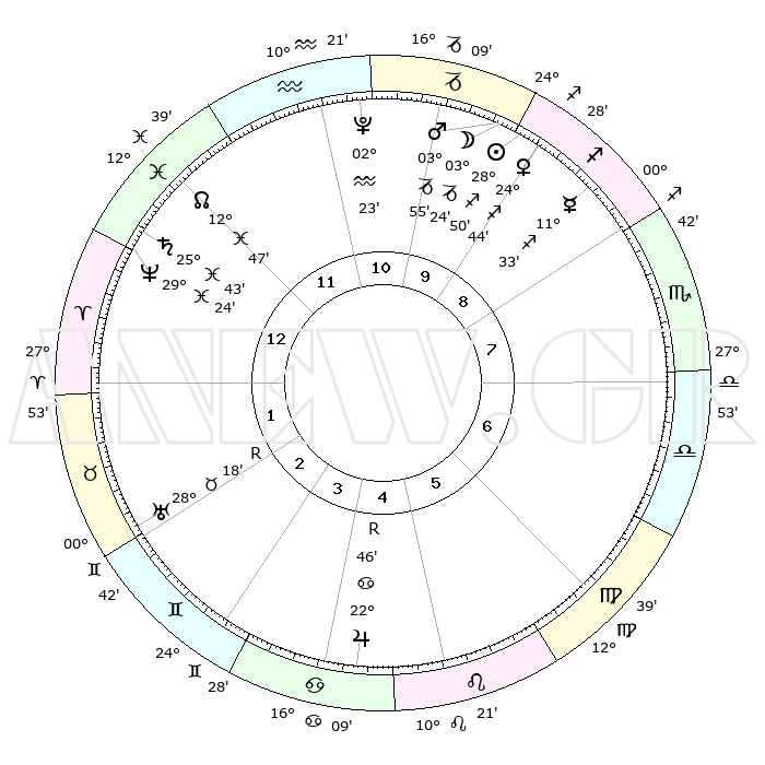 | | ΘΕΣΕΙΣ ΠΛΑΝΗΤΩΝ ΑΣΤΡΟΛΟΓΙΚΟΥ ΧΑΡΤΗ ΤΗΣ ΣΤΙΓΜΗΣ ΑΥΤΗΣ | | | | Πλανήτης | Ζώδιο | Μοίρες | Δεκαήμ. | Σε οίκο | Απόκλιση | | Ακμές των οίκων | | Ηλιος | Τοξότης | 28°46' | Τρίτο | 10 | 23 S 26 | | 1ος | 16°31' | Ιχθείς | | Σελήνη | Αιγόκερως | 02°32' | Πρώτο | 10 | 28 S 06 | | 2ος | 29°43' | Κριός | | Ερμής | Τοξότης | 11°27' | Δεύτερο | 9 | 21 S 19 | | 3ος | 29°20' | Ταύρος | | Αφροδίτη | Τοξότης | 24°38' | Τρίτο | 10 | 23 S 23 | | 4ος | 22°23' | Δίδυμοι | | Αρης | Αιγόκερως | 03°52' | Πρώτο | 10 | 24 S 11 | | 5ος | 14°14' | Καρκίνος | | Δίας | Καρκίνος | 22°47'R | Τρίτο | 5 | 21 N 43 | | 6ος | 09°43' | Λέων | | Κρόνος | Ιχθείς | 25°43' | Τρίτο | 1 | 03 S 49 | | 7ος | 16°31' | Παρθένος | | Ουρανός | Ταύρος | 28°18'R | Τρίτο | 2 | 19 N 35 | | 8ος | 29°43' | Ζυγός | | Ποσειδώνας | Ιχθείς | 29°24' | Τρίτο | 1 | 01 S 28 | | 9ος | 29°20' | Σκορπιός | | Πλούτωνας | Υδροχόος | 02°23' | Πρώτο | 11 | 23 S 17 | | 10ος | 22°23' | Τοξότης | | Β. Δεσμός | Ιχθείς | 12°47' | Δεύτερο | 12 | 06 S 46 | | 11ος | 14°14' | Αιγόκερως | | Ωροσκόπος | Ιχθείς | 16°31' | Δεύτερο | | | 12ος | 09°43' | Υδροχόος | | Μεσουράνημα | Τοξότης | 22°23' | Τρίτο | | | |