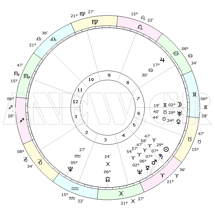 | | ΘΕΣΕΙΣ ΠΛΑΝΗΤΩΝ ΑΣΤΡΟΛΟΓΙΚΟΥ ΧΑΡΤΗ ΤΗΣ ΣΤΙΓΜΗΣ ΑΥΤΗΣ | | | | Πλανήτης | Ζώδιο | Μοίρες | Δεκαήμ. | Σε οίκο | Απόκλιση | | Ακμές των οίκων | | Ηλιος | Κριός | 29°43' | Τρίτο | 6 | 11 N 22 | | 1ος | 17°49' | Σκορπιός | | Σελήνη | Δίδυμοι | 01°22' | Πρώτο | 7 | 25 N 23 | | 2ος | 17°33' | Τοξότης | | Ερμής | Κριός | 06°51' | Πρώτο | 5 | 00 N 18 | | 3ος | 21°24' | Αιγόκερως | | Αφροδίτη | Ταύρος | 24°39' | Τρίτο | 7 | 19 N 18 | | 4ος | 26°52' | Υδροχόος | | Αρης | Κριός | 07°44' | Πρώτο | 5 | 02 N 11 | | 5ος | 29°06' | Ιχθείς | | Δίας | Καρκίνος | 17°29' | Δεύτερο | 8 | 22 N 40 | | 6ος | 25°47' | Κριός | | Κρόνος | Κριός | 07°57' | Πρώτο | 5 | 01 N 11 | | 7ος | 17°49' | Ταύρος | | Ουρανός | Ταύρος | 29°40' | Τρίτο | 7 | 19 N 55 | | 8ος | 17°33' | Δίδυμοι | | Ποσειδώνας | Κριός | 02°53' | Πρώτο | 5 | 00 S 03 | | 9ος | 21°24' | Καρκίνος | | Πλούτωνας | Υδροχόος | 05°27' | Πρώτο | 3 | 22 S 48 | | 10ος | 26°52' | Λέων | | Β. Δεσμός | Ιχθείς | 06°25' | Πρώτο | 4 | 09 S 09 | | 11ος | 29°06' | Παρθένος | | Ωροσκόπος | Σκορπιός | 17°49' | Δεύτερο | | | 12ος | 25°47' | Ζυγός | | Μεσουράνημα | Λέων | 26°52' | Τρίτο | | | |