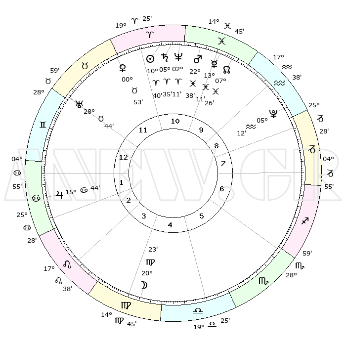 | | ΘΕΣΕΙΣ ΠΛΑΝΗΤΩΝ ΑΣΤΡΟΛΟΓΙΚΟΥ ΧΑΡΤΗ ΤΗΣ ΣΤΙΓΜΗΣ ΑΥΤΗΣ | | | | Πλανήτης | Ζώδιο | Μοίρες | Δεκαήμ. | Σε οίκο | Απόκλιση | | Ακμές των οίκων | | Ηλιος | Κριός | 10°36' | Δεύτερο | 11 | 04 N 12 | | 1ος | 11°58' | Δίδυμοι | | Σελήνη | Παρθένος | 19°31' | Δεύτερο | 4 | 03 N 15 | | 2ος | 04°40' | Καρκίνος | | Ερμής | Ιχθείς | 13°08' | Δεύτερο | 10 | 07 S 44 | | 3ος | 25°52' | Καρκίνος | | Αφροδίτη | Ταύρος | 00°48' | Πρώτο | 12 | 11 N 18 | | 4ος | 19°44' | Λέων | | Αρης | Ιχθείς | 22°35' | Τρίτο | 11 | 03 S 54 | | 5ος | 20°23' | Παρθένος | | Δίας | Καρκίνος | 15°44' | Δεύτερο | 2 | 22 N 52 | | 6ος | 00°17' | Σκορπιός | | Κρόνος | Κριός | 05°35' | Πρώτο | 11 | 00 N 16 | | 7ος | 11°58' | Τοξότης | | Ουρανός | Ταύρος | 28°44' | Τρίτο | 12 | 19 N 42 | | 8ος | 04°40' | Αιγόκερως | | Ποσειδώνας | Κριός | 02°11' | Πρώτο | 11 | 00 S 20 | | 9ος | 25°52' | Αιγόκερως | | Πλούτωνας | Υδροχόος | 05°12' | Πρώτο | 9 | 22 S 47 | | 10ος | 19°44' | Υδροχόος | | Β. Δεσμός | Ιχθείς | 07°26' | Πρώτο | 10 | 08 S 47 | | 11ος | 20°23' | Ιχθείς | | Ωροσκόπος | Δίδυμοι | 11°58' | Δεύτερο | | | 12ος | 00°17' | Ταύρος | | Μεσουράνημα | Υδροχόος | 19°44' | Δεύτερο | | | |