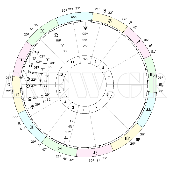 | | ΘΕΣΕΙΣ ΠΛΑΝΗΤΩΝ ΑΣΤΡΟΛΟΓΙΚΟΥ ΧΑΡΤΗ ΤΗΣ ΣΤΙΓΜΗΣ ΑΥΤΗΣ | | | | Πλανήτης | Ζώδιο | Μοίρες | Δεκαήμ. | Σε οίκο | Απόκλιση | | Ακμές των οίκων | | Ηλιος | Κριός | 27°08' | Τρίτο | 1 | 10 N 27 | | 1ος | 07°18' | Κριός | | Σελήνη | Κριός | 22°06' | Τρίτο | 1 | 11 N 55 | | 2ος | 15°45' | Ταύρος | | Ερμής | Κριός | 02°52' | Πρώτο | 12 | 01 S 17 | | 3ος | 12°05' | Δίδυμοι | | Αφροδίτη | Ταύρος | 21°25' | Τρίτο | 2 | 18 N 22 | | 4ος | 04°06' | Καρκίνος | | Αρης | Κριός | 05°41' | Πρώτο | 12 | 01 N 22 | | 5ος | 26°47' | Καρκίνος | | Δίας | Καρκίνος | 17°11' | Δεύτερο | 4 | 22 N 42 | | 6ος | 25°21' | Λέων | | Κρόνος | Κριός | 07°38' | Πρώτο | 1 | 01 N 03 | | 7ος | 07°18' | Ζυγός | | Ουρανός | Ταύρος | 29°32' | Τρίτο | 2 | 19 N 53 | | 8ος | 15°45' | Σκορπιός | | Ποσειδώνας | Κριός | 02°48' | Πρώτο | 12 | 00 S 06 | | 9ος | 12°05' | Τοξότης | | Πλούτωνας | Υδροχόος | 05°25' | Πρώτο | 11 | 22 S 47 | | 10ος | 04°06' | Αιγόκερως | | Β. Δεσμός | Ιχθείς | 06°33' | Πρώτο | 12 | 09 S 06 | | 11ος | 26°47' | Αιγόκερως | | Ωροσκόπος | Κριός | 07°18' | Πρώτο | | | 12ος | 25°21' | Υδροχόος | | Μεσουράνημα | Αιγόκερως | 04°06' | Πρώτο | | | |