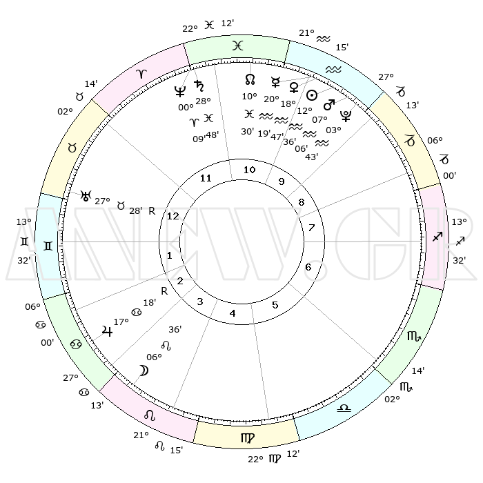 | | ΘΕΣΕΙΣ ΠΛΑΝΗΤΩΝ ΑΣΤΡΟΛΟΓΙΚΟΥ ΧΑΡΤΗ ΤΗΣ ΣΤΙΓΜΗΣ ΑΥΤΗΣ | | | | Πλανήτης | Ζώδιο | Μοίρες | Δεκαήμ. | Σε οίκο | Απόκλιση | | Ακμές των οίκων | | Ηλιος | Υδροχόος | 12°32' | Δεύτερο | 10 | 17 S 02 | | 1ος | 15°26' | Ταύρος | | Σελήνη | Λέων | 05°40' | Πρώτο | 4 | 21 N 39 | | 2ος | 13°33' | Δίδυμοι | | Ερμής | Υδροχόος | 20°12' | Τρίτο | 10 | 16 S 31 | | 3ος | 05°46' | Καρκίνος | | Αφροδίτη | Υδροχόος | 18°42' | Δεύτερο | 10 | 16 S 31 | | 4ος | 27°45' | Καρκίνος | | Αρης | Υδροχόος | 07°03' | Πρώτο | 10 | 19 S 31 | | 5ος | 23°57' | Λέων | | Δίας | Καρκίνος | 17°19'R | Δεύτερο | 3 | 22 N 37 | | 6ος | 29°45' | Παρθένος | | Κρόνος | Ιχθείς | 28°48' | Τρίτο | 11 | 02 S 28 | | 7ος | 15°26' | Σκορπιός | | Ουρανός | Ταύρος | 27°28'R | Τρίτο | 1 | 19 N 24 | | 8ος | 13°33' | Τοξότης | | Ποσειδώνας | Κριός | 00°09' | Πρώτο | 12 | 01 S 09 | | 9ος | 05°46' | Αιγόκερως | | Πλούτωνας | Υδροχόος | 03°43' | Πρώτο | 10 | 23 S 01 | | 10ος | 27°45' | Αιγόκερως | | Β. Δεσμός | Ιχθείς | 10°30' | Δεύτερο | 11 | 07 S 38 | | 11ος | 23°57' | Υδροχόος | | Ωροσκόπος | Ταύρος | 15°26' | Δεύτερο | | | 12ος | 29°45' | Ιχθείς | | Μεσουράνημα | Αιγόκερως | 27°45' | Τρίτο | | | |