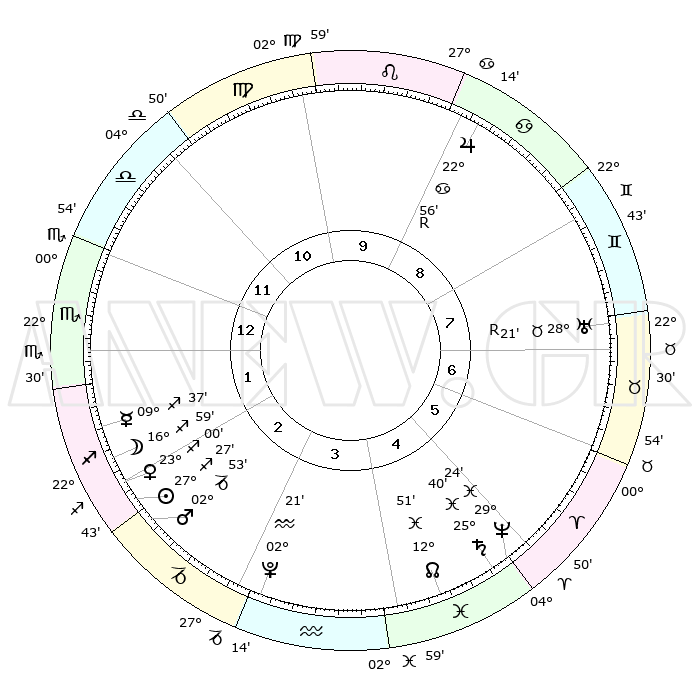 | | ΘΕΣΕΙΣ ΠΛΑΝΗΤΩΝ ΑΣΤΡΟΛΟΓΙΚΟΥ ΧΑΡΤΗ ΤΗΣ ΣΤΙΓΜΗΣ ΑΥΤΗΣ | | | | Πλανήτης | Ζώδιο | Μοίρες | Δεκαήμ. | Σε οίκο | Απόκλιση | | Ακμές των οίκων | | Ηλιος | Τοξότης | 27°22' | Τρίτο | 2 | 23 S 24 | | 1ος | 00°22' | Σκορπιός | | Σελήνη | Τοξότης | 16°04' | Δεύτερο | 2 | 27 S 40 | | 2ος | 28°48' | Σκορπιός | | Ερμής | Τοξότης | 09°30' | Πρώτο | 2 | 20 S 52 | | 3ος | 00°47' | Αιγόκερως | | Αφροδίτη | Τοξότης | 22°55' | Τρίτο | 2 | 23 S 15 | | 4ος | 05°00' | Υδροχόος | | Αρης | Αιγόκερως | 02°50' | Πρώτο | 3 | 24 S 12 | | 5ος | 07°55' | Ιχθείς | | Δίας | Καρκίνος | 22°56'R | Τρίτο | 9 | 21 N 41 | | 6ος | 06°33' | Κριός | | Κρόνος | Ιχθείς | 25°40' | Τρίτο | 5 | 03 S 50 | | 7ος | 00°22' | Ταύρος | | Ουρανός | Ταύρος | 28°21'R | Τρίτο | 7 | 19 N 35 | | 8ος | 28°48' | Ταύρος | | Ποσειδώνας | Ιχθείς | 29°24' | Τρίτο | 5 | 01 S 28 | | 9ος | 00°47' | Καρκίνος | | Πλούτωνας | Υδροχόος | 02°21' | Πρώτο | 3 | 23 S 18 | | 10ος | 05°00' | Λέων | | Β. Δεσμός | Ιχθείς | 12°51' | Δεύτερο | 5 | 06 S 44 | | 11ος | 07°55' | Παρθένος | | Ωροσκόπος | Σκορπιός | 00°22' | Πρώτο | | | 12ος | 06°33' | Ζυγός | | Μεσουράνημα | Λέων | 05°00' | Πρώτο | | | |