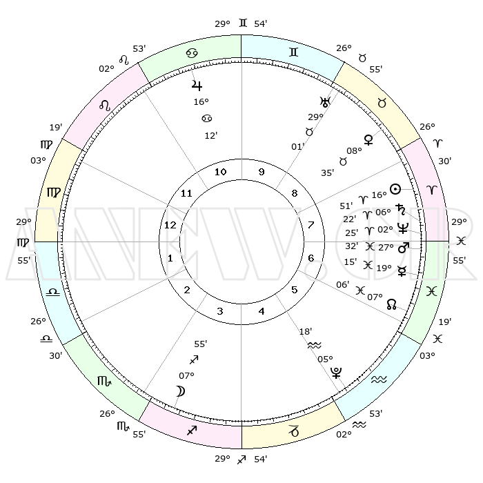 | | ΘΕΣΕΙΣ ΠΛΑΝΗΤΩΝ ΑΣΤΡΟΛΟΓΙΚΟΥ ΧΑΡΤΗ ΤΗΣ ΣΤΙΓΜΗΣ ΑΥΤΗΣ | | | | Πλανήτης | Ζώδιο | Μοίρες | Δεκαήμ. | Σε οίκο | Απόκλιση | | Ακμές των οίκων | | Ηλιος | Κριός | 16°47' | Δεύτερο | 8 | 06 N 36 | | 1ος | 10°54' | Παρθένος | | Σελήνη | Τοξότης | 07°09' | Πρώτο | 3 | 26 S 35 | | 2ος | 05°52' | Ζυγός | | Ερμής | Ιχθείς | 19°11' | Δεύτερο | 7 | 06 S 09 | | 3ος | 05°22' | Σκορπιός | | Αφροδίτη | Ταύρος | 08°31' | Πρώτο | 9 | 14 N 08 | | 4ος | 08°19' | Τοξότης | | Αρης | Ιχθείς | 27°29' | Τρίτο | 7 | 01 S 56 | | 5ος | 11°52' | Αιγόκερως | | Δίας | Καρκίνος | 16°11' | Δεύτερο | 11 | 22 N 49 | | 6ος | 13°07' | Υδροχόος | | Κρόνος | Κριός | 06°21' | Πρώτο | 8 | 00 N 34 | | 7ος | 10°54' | Ιχθείς | | Ουρανός | Ταύρος | 29°01' | Τρίτο | 9 | 19 N 46 | | 8ος | 05°52' | Κριός | | Ποσειδώνας | Κριός | 02°25' | Πρώτο | 7 | 00 S 14 | | 9ος | 05°22' | Ταύρος | | Πλούτωνας | Υδροχόος | 05°18' | Πρώτο | 5 | 22 S 47 | | 10ος | 08°19' | Δίδυμοι | | Β. Δεσμός | Ιχθείς | 07°06' | Πρώτο | 6 | 08 S 54 | | 11ος | 11°52' | Καρκίνος | | Ωροσκόπος | Παρθένος | 10°54' | Δεύτερο | | | 12ος | 13°07' | Λέων | | Μεσουράνημα | Δίδυμοι | 08°19' | Πρώτο | | | |