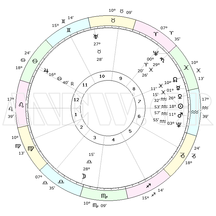 | | ΘΕΣΕΙΣ ΠΛΑΝΗΤΩΝ ΑΣΤΡΟΛΟΓΙΚΟΥ ΧΑΡΤΗ ΤΗΣ ΣΤΙΓΜΗΣ ΑΥΤΗΣ | | | | Πλανήτης | Ζώδιο | Μοίρες | Δεκαήμ. | Σε οίκο | Απόκλιση | | Ακμές των οίκων | | Ηλιος | Υδροχόος | 18°49' | Δεύτερο | 8 | 15 S 11 | | 1ος | 27°53' | Καρκίνος | | Σελήνη | Ζυγός | 27°25' | Τρίτο | 4 | 14 S 13 | | 2ος | 18°47' | Λέων | | Ερμής | Ιχθείς | 01°08' | Πρώτο | 8 | 12 S 15 | | 3ος | 13°33' | Παρθένος | | Αφροδίτη | Υδροχόος | 26°27' | Τρίτο | 8 | 14 S 03 | | 4ος | 14°18' | Ζυγός | | Αρης | Υδροχόος | 11°54' | Δεύτερο | 7 | 18 S 14 | | 5ος | 20°23' | Σκορπιός | | Δίας | Καρκίνος | 16°40'R | Δεύτερο | 12 | 22 N 42 | | 6ος | 26°27' | Τοξότης | | Κρόνος | Ιχθείς | 29°26' | Τρίτο | 9 | 02 S 13 | | 7ος | 27°53' | Αιγόκερως | | Ουρανός | Ταύρος | 27°28' | Τρίτο | 11 | 19 N 24 | | 8ος | 18°47' | Υδροχόος | | Ποσειδώνας | Κριός | 00°20' | Πρώτο | 9 | 01 S 04 | | 9ος | 13°33' | Ιχθείς | | Πλούτωνας | Υδροχόος | 03°54' | Πρώτο | 7 | 22 S 59 | | 10ος | 14°18' | Κριός | | Β. Δεσμός | Ιχθείς | 10°11' | Δεύτερο | 8 | 07 S 45 | | 11ος | 20°23' | Ταύρος | | Ωροσκόπος | Καρκίνος | 27°53' | Τρίτο | | | 12ος | 26°27' | Δίδυμοι | | Μεσουράνημα | Κριός | 14°18' | Δεύτερο | | | |
