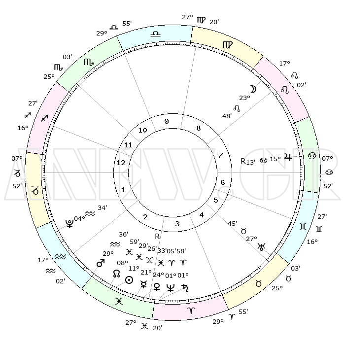 | | ΘΕΣΕΙΣ ΠΛΑΝΗΤΩΝ ΑΣΤΡΟΛΟΓΙΚΟΥ ΧΑΡΤΗ ΤΗΣ ΣΤΙΓΜΗΣ ΑΥΤΗΣ | | | | Πλανήτης | Ζώδιο | Μοίρες | Δεκαήμ. | Σε οίκο | Απόκλιση | | Ακμές των οίκων | | Ηλιος | Ιχθείς | 11°22' | Δεύτερο | 3 | 07 S 18 | | 1ος | 01°49' | Τοξότης | | Σελήνη | Λέων | 22°14' | Τρίτο | 9 | 15 N 32 | | 2ος | 03°13' | Αιγόκερως | | Ερμής | Ιχθείς | 21°30'R | Τρίτο | 4 | 00 S 13 | | 3ος | 09°13' | Υδροχόος | | Αφροδίτη | Ιχθείς | 24°25' | Τρίτο | 4 | 03 S 27 | | 4ος | 15°18' | Ιχθείς | | Αρης | Υδροχόος | 29°30' | Τρίτο | 3 | 12 S 40 | | 5ος | 16°06' | Κριός | | Δίας | Καρκίνος | 15°13'R | Δεύτερο | 8 | 22 N 54 | | 6ος | 10°54' | Ταύρος | | Κρόνος | Κριός | 01°57' | Πρώτο | 4 | 01 S 11 | | 7ος | 01°49' | Δίδυμοι | | Ουρανός | Ταύρος | 27°45' | Τρίτο | 6 | 19 N 29 | | 8ος | 03°13' | Καρκίνος | | Ποσειδώνας | Κριός | 01°05' | Πρώτο | 4 | 00 S 46 | | 9ος | 09°13' | Λέων | | Πλούτωνας | Υδροχόος | 04°34' | Πρώτο | 2 | 22 S 52 | | 10ος | 15°18' | Παρθένος | | Β. Δεσμός | Ιχθείς | 08°60' | Πρώτο | 3 | 08 S 12 | | 11ος | 16°06' | Ζυγός | | Ωροσκόπος | Τοξότης | 01°49' | Πρώτο | | | 12ος | 10°54' | Σκορπιός | | Μεσουράνημα | Παρθένος | 15°18' | Δεύτερο | | | |