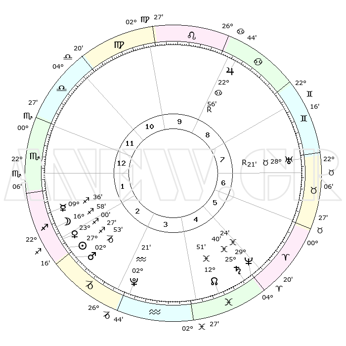 | | ΘΕΣΕΙΣ ΠΛΑΝΗΤΩΝ ΑΣΤΡΟΛΟΓΙΚΟΥ ΧΑΡΤΗ ΤΗΣ ΣΤΙΓΜΗΣ ΑΥΤΗΣ | | | | Πλανήτης | Ζώδιο | Μοίρες | Δεκαήμ. | Σε οίκο | Απόκλιση | | Ακμές των οίκων | | Ηλιος | Τοξότης | 27°04' | Τρίτο | 5 | 23 S 24 | | 1ος | 02°03' | Λέων | | Σελήνη | Τοξότης | 12°28' | Δεύτερο | 5 | 27 S 14 | | 2ος | 23°13' | Λέων | | Ερμής | Τοξότης | 09°05' | Πρώτο | 5 | 20 S 45 | | 3ος | 18°33' | Παρθένος | | Αφροδίτη | Τοξότης | 22°32' | Τρίτο | 5 | 23 S 13 | | 4ος | 19°50' | Ζυγός | | Αρης | Αιγόκερως | 02°36' | Πρώτο | 6 | 24 S 13 | | 5ος | 25°49' | Σκορπιός | | Δίας | Καρκίνος | 22°58'R | Τρίτο | 12 | 21 N 41 | | 6ος | 01°11' | Αιγόκερως | | Κρόνος | Ιχθείς | 25°39' | Τρίτο | 9 | 03 S 51 | | 7ος | 02°03' | Υδροχόος | | Ουρανός | Ταύρος | 28°22'R | Τρίτο | 11 | 19 N 36 | | 8ος | 23°13' | Υδροχόος | | Ποσειδώνας | Ιχθείς | 29°24' | Τρίτο | 9 | 01 S 28 | | 9ος | 18°33' | Ιχθείς | | Πλούτωνας | Υδροχόος | 02°20' | Πρώτο | 7 | 23 S 18 | | 10ος | 19°50' | Κριός | | Β. Δεσμός | Ιχθείς | 12°52' | Δεύτερο | 8 | 06 S 44 | | 11ος | 25°49' | Ταύρος | | Ωροσκόπος | Λέων | 02°03' | Πρώτο | | | 12ος | 01°11' | Καρκίνος | | Μεσουράνημα | Κριός | 19°50' | Δεύτερο | | | |