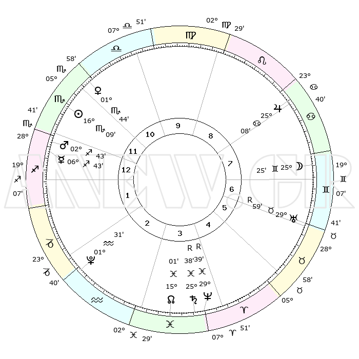 | | ΘΕΣΕΙΣ ΠΛΑΝΗΤΩΝ ΑΣΤΡΟΛΟΓΙΚΟΥ ΧΑΡΤΗ ΤΗΣ ΣΤΙΓΜΗΣ ΑΥΤΗΣ | | | | Πλανήτης | Ζώδιο | Μοίρες | Δεκαήμ. | Σε οίκο | Απόκλιση | | Ακμές των οίκων | | Ηλιος | Σκορπιός | 15°57' | Δεύτερο | 2 | 16 S 36 | | 1ος | 17°08' | Ζυγός | | Σελήνη | Δίδυμοι | 22°16' | Τρίτο | 9 | 28 N 15 | | 2ος | 14°49' | Σκορπιός | | Ερμής | Τοξότης | 06°40' | Πρώτο | 2 | 23 S 57 | | 3ος | 15°57' | Τοξότης | | Αφροδίτη | Σκορπιός | 01°28' | Πρώτο | 1 | 10 S 42 | | 4ος | 19°24' | Αιγόκερως | | Αρης | Τοξότης | 02°34' | Πρώτο | 2 | 21 S 07 | | 5ος | 22°21' | Υδροχόος | | Δίας | Καρκίνος | 25°08' | Τρίτο | 10 | 21 N 12 | | 6ος | 21°59' | Ιχθείς | | Κρόνος | Ιχθείς | 25°38'R | Τρίτο | 6 | 03 S 59 | | 7ος | 17°08' | Κριός | | Ουρανός | Ταύρος | 29°60'R | Τρίτο | 8 | 19 N 56 | | 8ος | 14°49' | Ταύρος | | Ποσειδώνας | Ιχθείς | 29°39'R | Τρίτο | 6 | 01 S 23 | | 9ος | 15°57' | Δίδυμοι | | Πλούτωνας | Υδροχόος | 01°31' | Πρώτο | 4 | 23 S 30 | | 10ος | 19°24' | Καρκίνος | | Β. Δεσμός | Ιχθείς | 15°01' | Δεύτερο | 5 | 05 S 54 | | 11ος | 22°21' | Λέων | | Ωροσκόπος | Ζυγός | 17°08' | Δεύτερο | | | 12ος | 21°59' | Παρθένος | | Μεσουράνημα | Καρκίνος | 19°24' | Δεύτερο | | | |