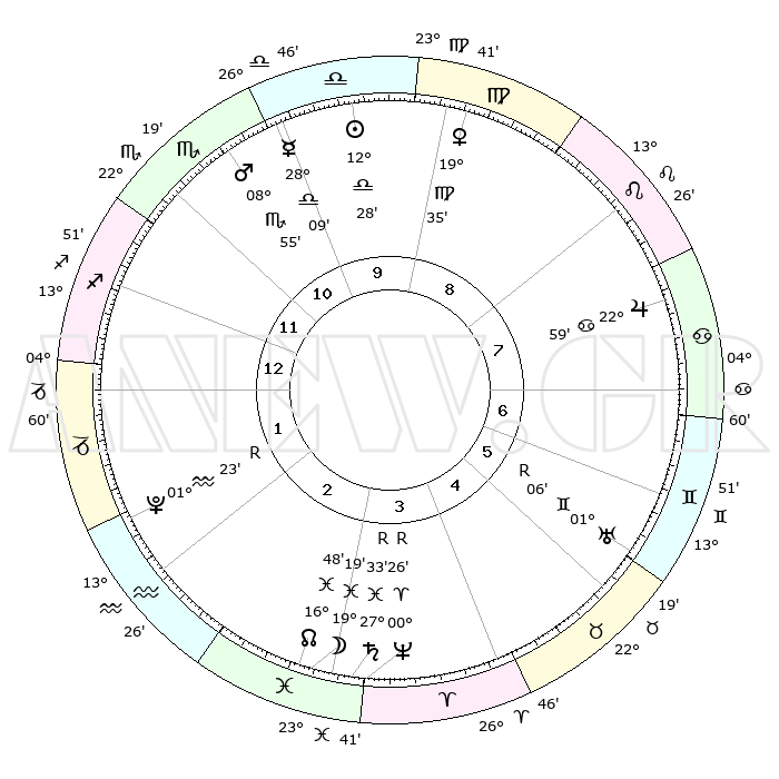 | ΘΕΣΕΙΣ ΠΛΑΝΗΤΩΝ ΑΣΤΡΟΛΟΓΙΚΟΥ ΧΑΡΤΗ ΤΗΣ ΣΤΙΓΜΗΣ ΑΥΤΗΣ | | Πλανήτης | Ζώδιο | Μοίρες | Δεκαήμ. | Σε οίκο | Απόκλιση | | Ακμές των οίκων | Ηλιος | Ζυγός | 12°22' | Δεύτερο | 10 | 04 S 53 | | 1ος | 00°37' | Τοξότης | Σελήνη | Ιχθείς | 17°44' | Δεύτερο | 4 | 04 S 54 | | 2ος | 01°50' | Αιγόκερως | Ερμής | Ζυγός | 27°59' | Τρίτο | 11 | 11 S 20 | | 3ος | 07°39' | Υδροχόος | Αφροδίτη | Παρθένος | 19°27' | Δεύτερο | 10 | 05 N 27 | | 4ος | 13°42' | Ιχθείς | Αρης | Σκορπιός | 08°51' | Πρώτο | 11 | 14 S 34 | | 5ος | 14°39' | Κριός | Δίας | Καρκίνος | 22°58' | Τρίτο | 8 | 21 N 30 | | 6ος | 09°37' | Ταύρος | Κρόνος | Ιχθείς | 27°34'R | Τρίτο | 4 | 03 S 16 | | 7ος | 00°37' | Δίδυμοι | Ουρανός | Δίδυμοι | 01°07'R | Πρώτο | 7 | 20 N 10 | | 8ος | 01°50' | Καρκίνος | Ποσειδώνας | Κριός | 00°26'R | Πρώτο | 4 | 01 S 05 | | 9ος | 07°39' | Λέων | Πλούτωνας | Υδροχόος | 01°23'R | Πρώτο | 2 | 23 S 32 | | 10ος | 13°42' | Παρθένος | Β. Δεσμός | Ιχθείς | 16°49' | Δεύτερο | 4 | 05 S 12 | | 11ος | 14°39' | Ζυγός | Ωροσκόπος | Τοξότης | 00°37' | Πρώτο | | | 12ος | 09°37' | Σκορπιός | Μεσουράνημα | Παρθένος | 13°42' | Δεύτερο | | | |