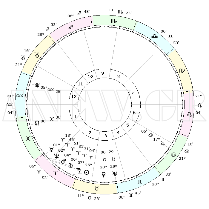 | | ΘΕΣΕΙΣ ΠΛΑΝΗΤΩΝ ΑΣΤΡΟΛΟΓΙΚΟΥ ΧΑΡΤΗ ΤΗΣ ΣΤΙΓΜΗΣ ΑΥΤΗΣ | | | | Πλανήτης | Ζώδιο | Μοίρες | Δεκαήμ. | Σε οίκο | Απόκλιση | | Ακμές των οίκων | | Ηλιος | Κριός | 26°01' | Τρίτο | 3 | 10 N 03 | | 1ος | 20°58' | Αιγόκερως | | Σελήνη | Κριός | 05°33' | Πρώτο | 2 | 04 N 23 | | 2ος | 03°19' | Ιχθείς | | Ερμής | Κριός | 01°12' | Πρώτο | 2 | 01 S 55 | | 3ος | 12°57' | Κριός | | Αφροδίτη | Ταύρος | 20°02' | Τρίτο | 4 | 17 N 57 | | 4ος | 13°03' | Ταύρος | | Αρης | Κριός | 04°48' | Πρώτο | 2 | 01 N 01 | | 5ος | 06°36' | Δίδυμοι | | Δίας | Καρκίνος | 17°04' | Δεύτερο | 6 | 22 N 43 | | 6ος | 27°49' | Δίδυμοι | | Κρόνος | Κριός | 07°30' | Πρώτο | 2 | 01 N 00 | | 7ος | 20°58' | Καρκίνος | | Ουρανός | Ταύρος | 29°28' | Τρίτο | 4 | 19 N 52 | | 8ος | 03°19' | Παρθένος | | Ποσειδώνας | Κριός | 02°46' | Πρώτο | 2 | 00 S 06 | | 9ος | 12°57' | Ζυγός | | Πλούτωνας | Υδροχόος | 05°25' | Πρώτο | 1 | 22 S 47 | | 10ος | 13°03' | Σκορπιός | | Β. Δεσμός | Ιχθείς | 06°37' | Πρώτο | 2 | 09 S 05 | | 11ος | 06°36' | Τοξότης | | Ωροσκόπος | Αιγόκερως | 20°58' | Τρίτο | | | 12ος | 27°49' | Τοξότης | | Μεσουράνημα | Σκορπιός | 13°03' | Δεύτερο | | | |